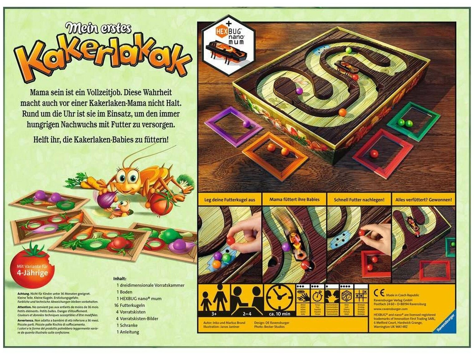 1 трехмерная кладовка, 1 половица, 1 Hexbug nano® Мама - таракан, 16 крошек еды, 4 ячейки для еды, 4 картинки с ячейками для еды, 1 барьер и инструкции.