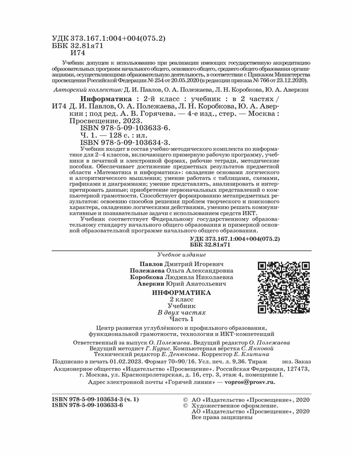 Информатика. 2 класс. Учебник. В 2-х частях. ФП (Павлов Дмитрий Игоревич, Полежаева Ольга Александровна, Коробкова Людмила Николаевна); Просвещение/Бином, 2023