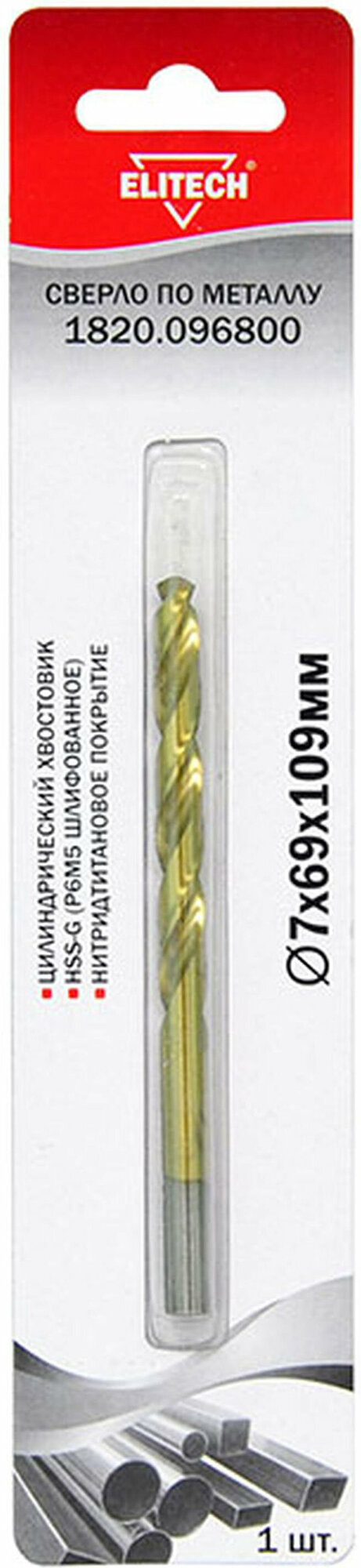 Сверло по металлу ELITECH 7х69х109мм,HSS-G, нитридтитановое покрытие, 1шт