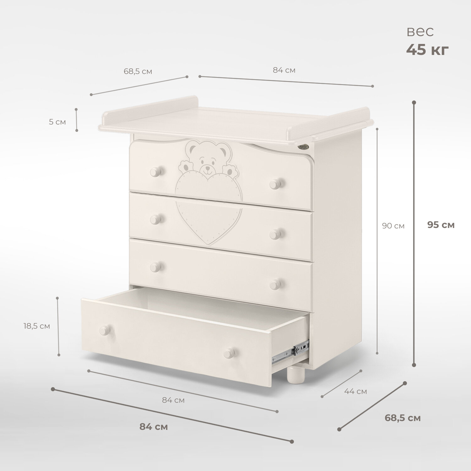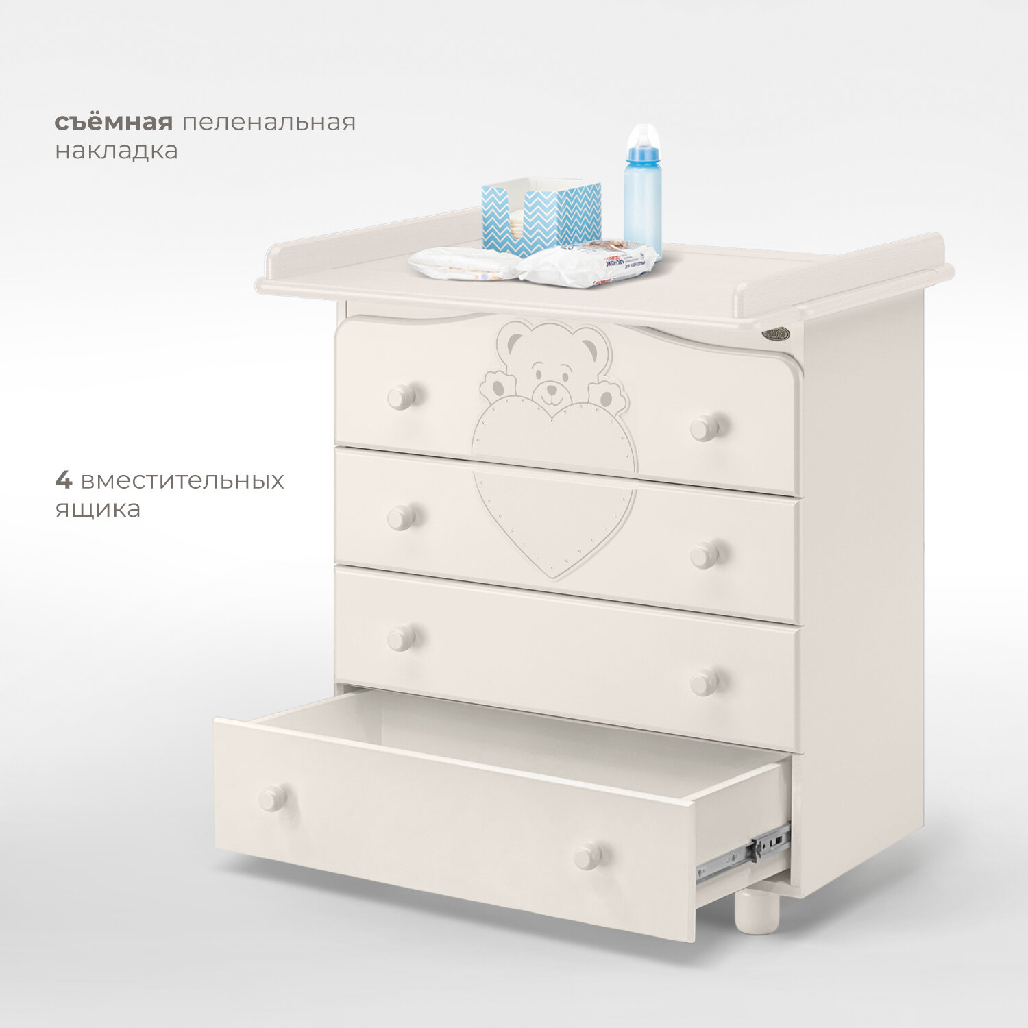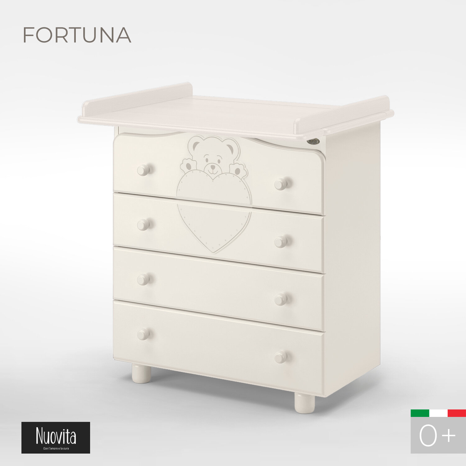 Комод Нуовита Фортуна оснащается легкосъемной пеленальной доской с двумя бортиками, которая о