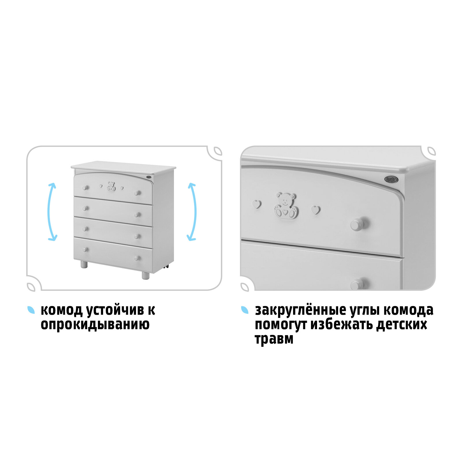 Детские комоды с пеленальным столом Nuovita Sorisso из коллекции 2018 года станут отличным приобретением для молодых родителей. Они очень удобны и практичны, так как оснащены четырьмя ящиками, в которых можно хранить все необходимые детские вещи и аксессуары, двумя колесами, обеспечивающими легкое перемещение изделия по квартире, и двумя ножками, гарантирующими устойчивость