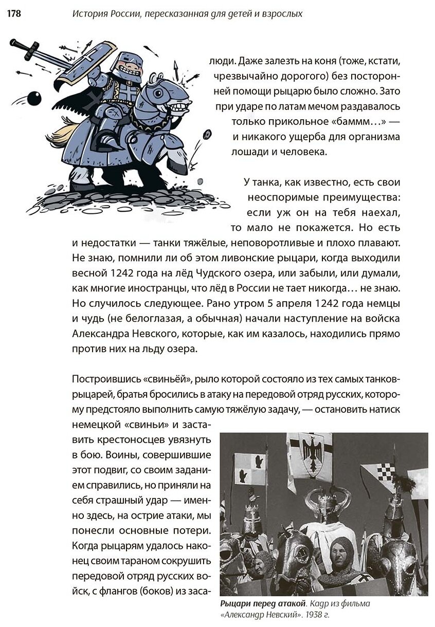 Задуманная как подражание "Сатирикону", "История России, пересказанная для детей и взрослых" так же последовательно и в пародийном ключе описывает события, происходившие на территории нашей страны, со времен появления здесь мамонтов и первых людей, но, в отличие от знаменитой книги сатириконцев, рассчитана в первую очередь на молодого читателя. Авторская подача материала и антисерьезный стиль повествования не делают при этом книгу менее познавательной и интересной.