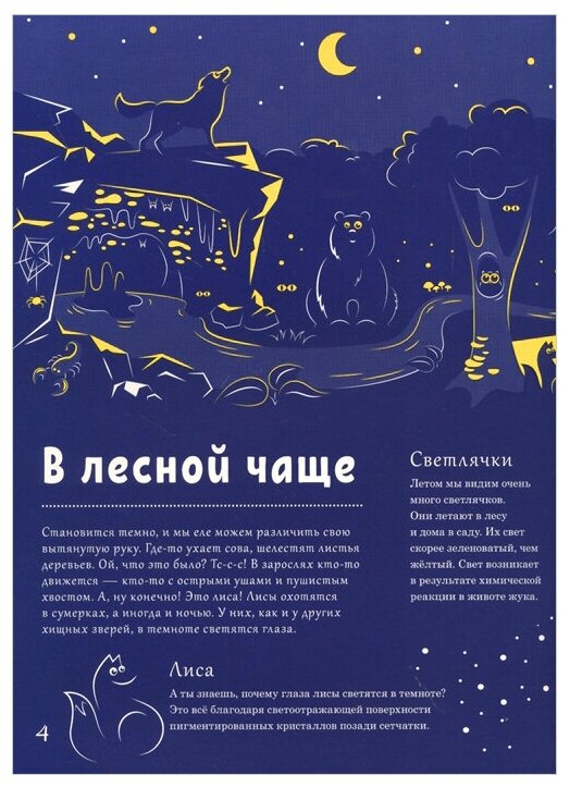 С незапамятных времён людей привлекал свет, исходящий от животных в дикой природе. Философы Древней Греции интересовались вещами, которые можно увидеть только в темноте. Благодаря этой книге ты откроешь для себя, как природа выглядит ночью. Ты узнаешь, что излучает свет в лесу, в небе и под водой. А ещё увидишь, как ночью выглядит Земля и какая страна сияет, словно туфелька Золушки.