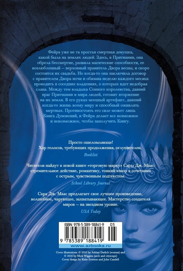 Фейра уже не та простая смертная девушка, какой была на землях людей. Здесь, в Притиании, она обрела бессмертие, развила магические способности, ее возлюбленный — верховный правитель Двора весны, и скоро состоится их свадьба. Но когда-то она заключила договор с правителем Двора ночи и обязана неделю каждого месяца проводить в соседних владениях, о которых идет недобрая слава. Между тем владыка Сонного королевства, давний враг Притиании и мира людей, готовит вторжение на их земли. В его руках мощный артефакт, давший когда-то жизнь всему миру и способный оживлять мертвых. Противостоять его силе может лишь Книга Дуновений, и Фейра делает все возможное и невозможное, чтобы заполучить Книгу.