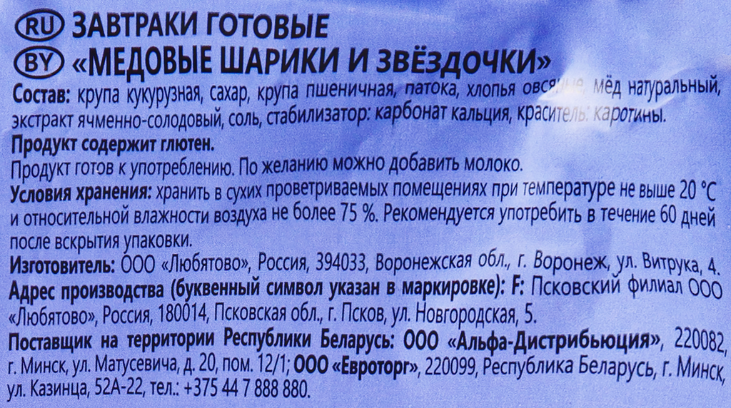 | Состав | Зерновые продукты (крупа кукурузная, хлопья овсяные, мука пшеничная из цельносмолотого зерна), сахар, мед натуральный, глюкоза, экстракт ячменно-солодовый, соль, краситель: бета-каротин, стабилизатор: кальция карбонат. |