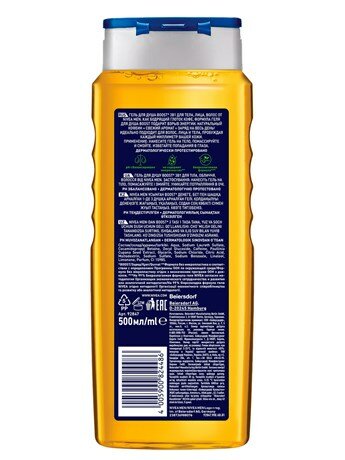 Первый гель для душа с кофеином 100% натурального происхождения! Проснись и зарядись энергией на весь день вместе с Nivea Men Boost 3в1 для тела, лица и волос. Новый заряжающий, охлаждающий и мужественный аромат, открывающийся аккордом свежих цитрусовых нот и пряным кардамоном, покоящимся на мягких древесных и мускусных нотах. Будь в тонусе - просыпайся!