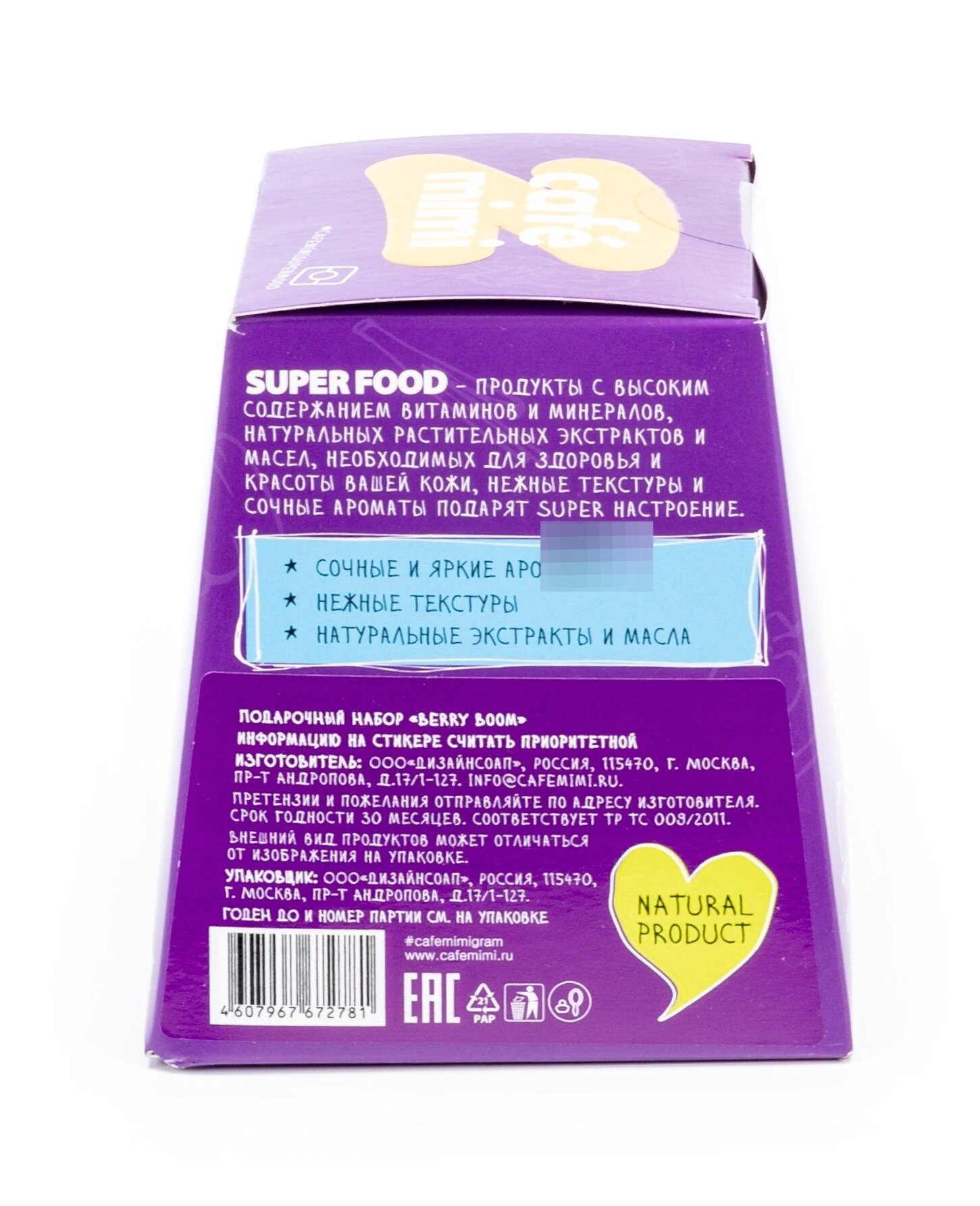 Гель для душа BERRY BOOM Aqua with infusion of: Vaccinium Myrtillus (Bilberry) Fruit Extract (экстракт Черники), Malpighia Glabra (West Indian Cherry) Fruit Extract (экстракт Ацероллы), Sodium Coco Sulfate, Cocamidopropyl Betaine (из Кокосового масла), Sodium Cocoamphoacetate, Vegetable Glycerin (растительного происхождения), Prunus Amygdalus Dulcis (Sweet Almond) Oil (масло Миндаля), D-panthenol (Провитамин В5), Spirulina Platensis Extract (экстракт Спирулины), Raphanus Sativus (Radish) Root Extract (экстракт Редиса), Citric Acid, Maltodextrin, Trehalose, Sodium Chloride, Perfume, Benzyl Alcohol, Benzoic Acid, Dehydroacetic Acid, Sodium Benzoate, Potassium Sorbate, Citronellol, Linalool. Мочалка 100% нейлон. Питательный крем для рук BERRY BOOM Aqua with infusion of: Vaccinium Myrtillus (Bilberry) Fruit Extract (экстракт Черники), Malpighia Glabra (West Indian Cherry) Fruit Extract (экстракт Ацероллы), Cetearyl Alcohol (из Кокосового масла), Glyceryl Stearate, Stearic Acid, Organic Persea Gratissima (Avocado) Oil (Органическое масло Авокадо), Vegetable Glycerin (растительного происхождения), Butyrospermum Parkii (Shea) Вutter (масло Ши), D-panthenol (провитамин В5), Perfume, Benzyl Аlcohol, Benzoic Acid, Dehydroacetic Acid, Lactic Acid, Citronellol, Linalool.