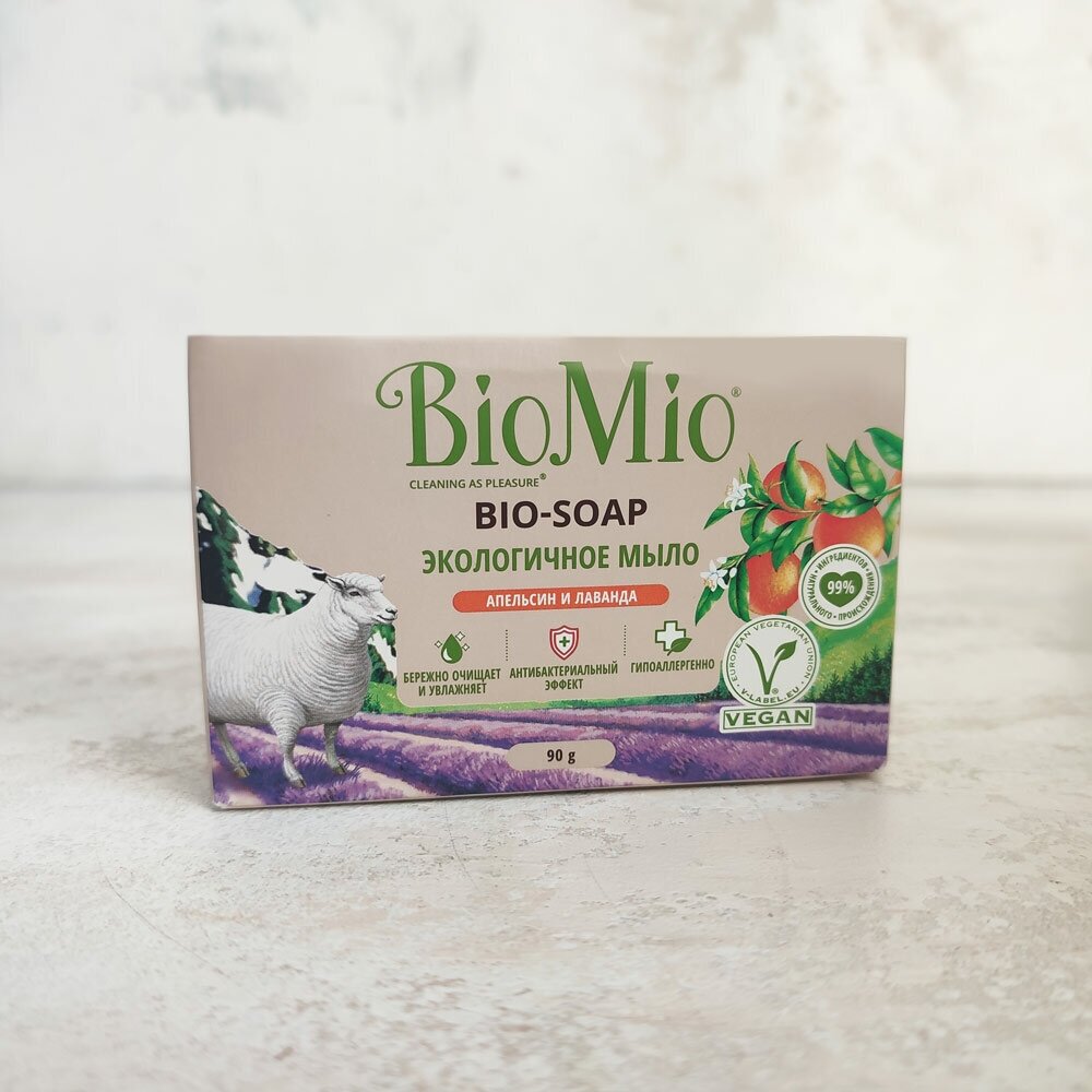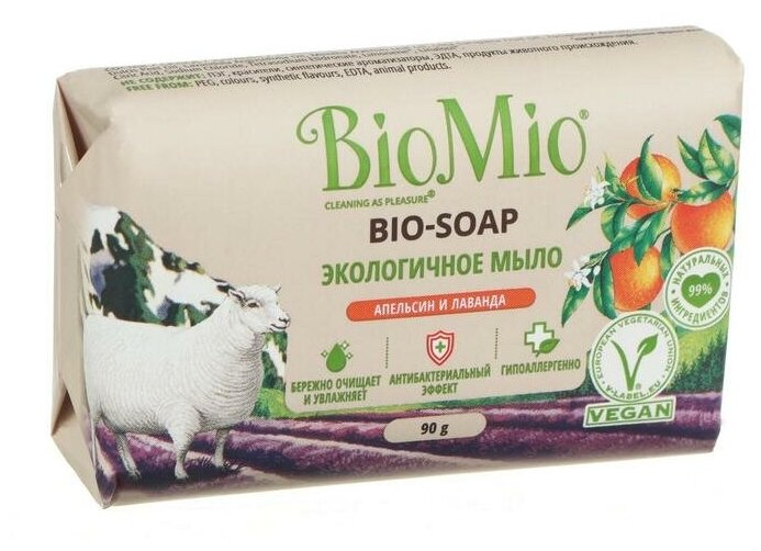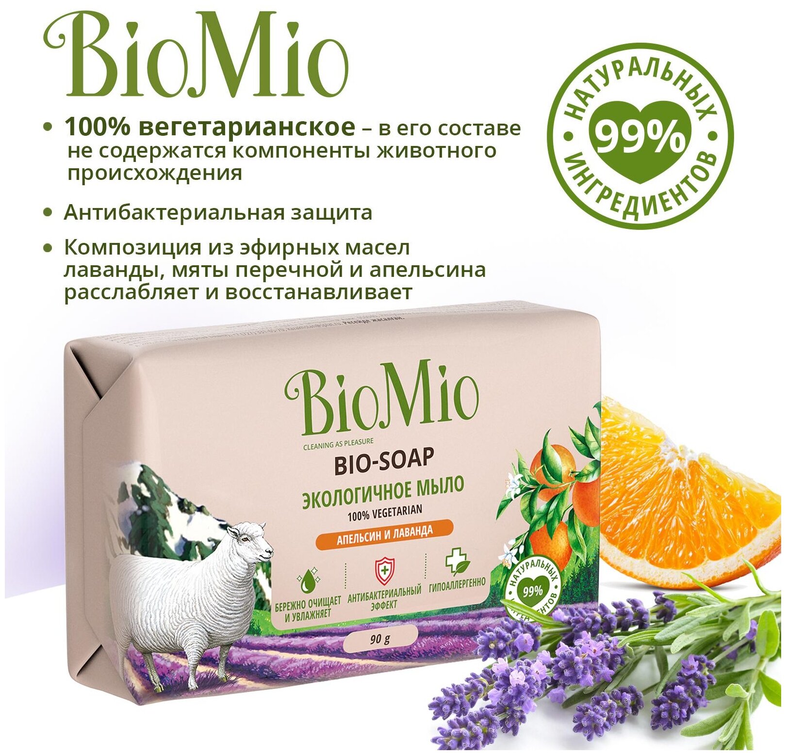 Экологичное туалетное мыло Bio-Soap с эфирными маслами лаванды, мяты перечной и апельсина - 100% вегетарианское – в его составе не содержатся компоненты животного происхождения. Мыло BioMio гипоаллергенно, благодаря чему отлично подходит для людей с чувствительной кожей.