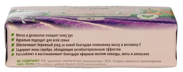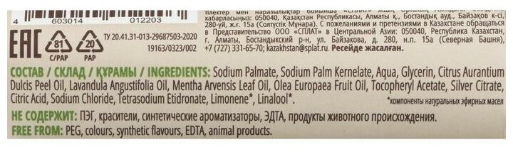 | Активные компоненты | Sodium Palmate, Sodium Palm Кernelate, Aqua, Glycerin, Citrus Aurantium Dulcis Peel Oil, Lavandula Angustifolia Oil, Mentha Arvensis Leaf Oil, Olea Europaea Fruit Oil, Tocopheryl Acetate, Silver Citrate, Citric Acid, Sodium Chloride, Tetrasodium Etidronate, Limonene, Linalool.Не содержит: ПЭГ, красители, синтетические ароматизаторы, ЭДТА, продукты животного происхождения. |