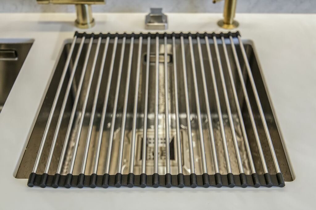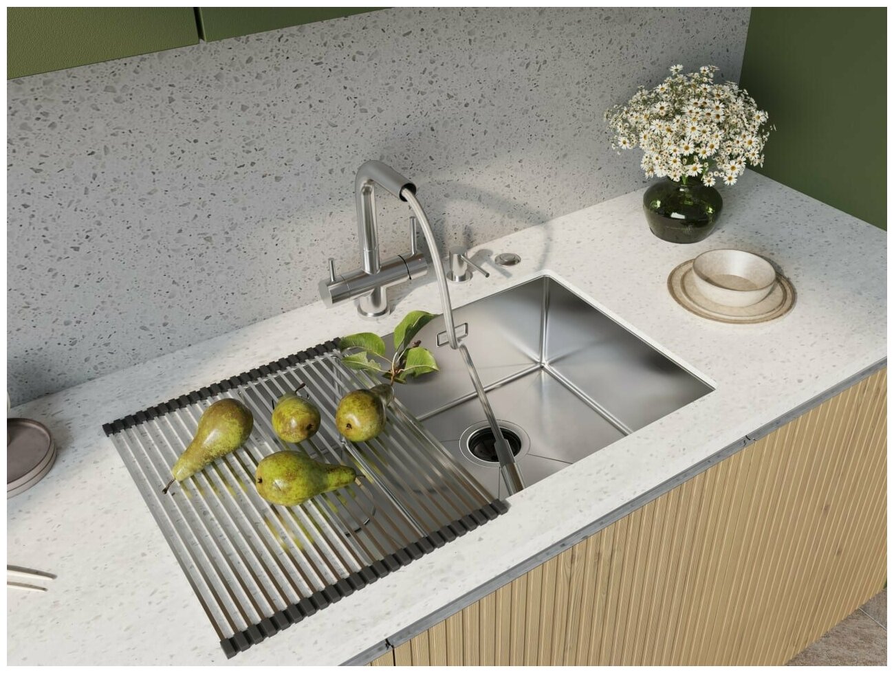 Очень качественно сделанный коврик. Удобно хранить. Использую и на раковине, и в качестве подставки под горячее. Долго сомневалась из-за цены. Можно намного дешевле купить подобный китайский. Но в новую кухню все-таки решила брать этот. Смотрится очень солидно и дорого. Удобно, что прутья толстые и квадратные ( легко ставить стакн, не перевернется). Мойка у меня blanco нержавейка 40×50. Все устроило.
