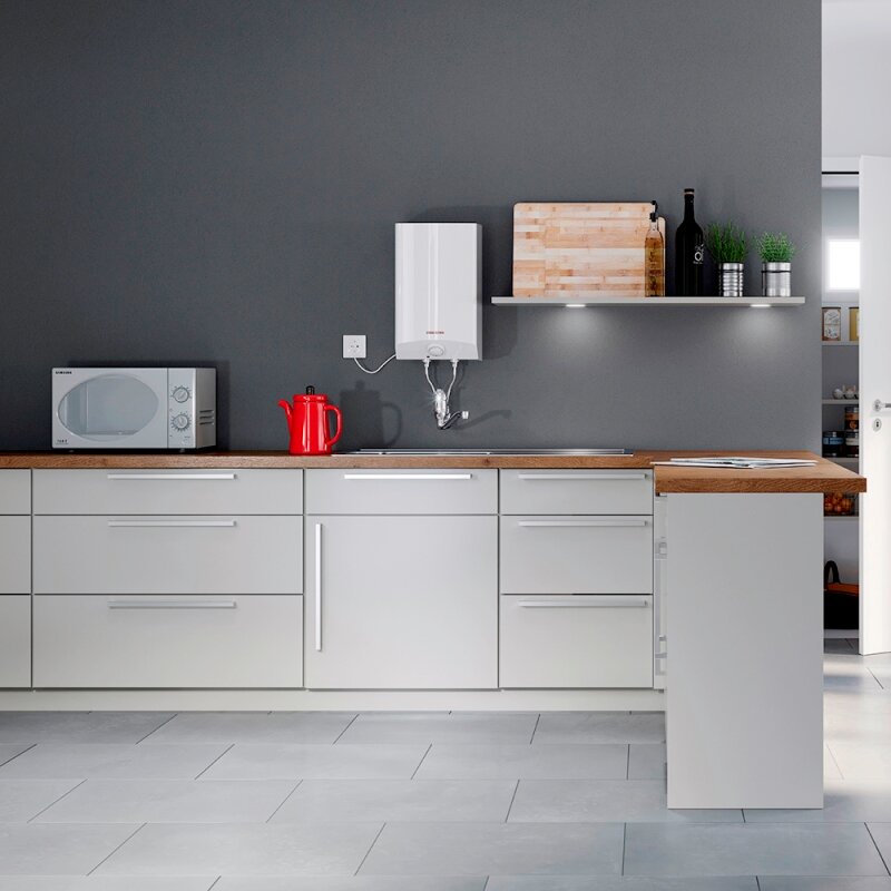 Универсальный накопительный водонагреватель для монтажа над раковиной объёмом 10 литров. Температура автоматически поддерживается на заданном уровне.