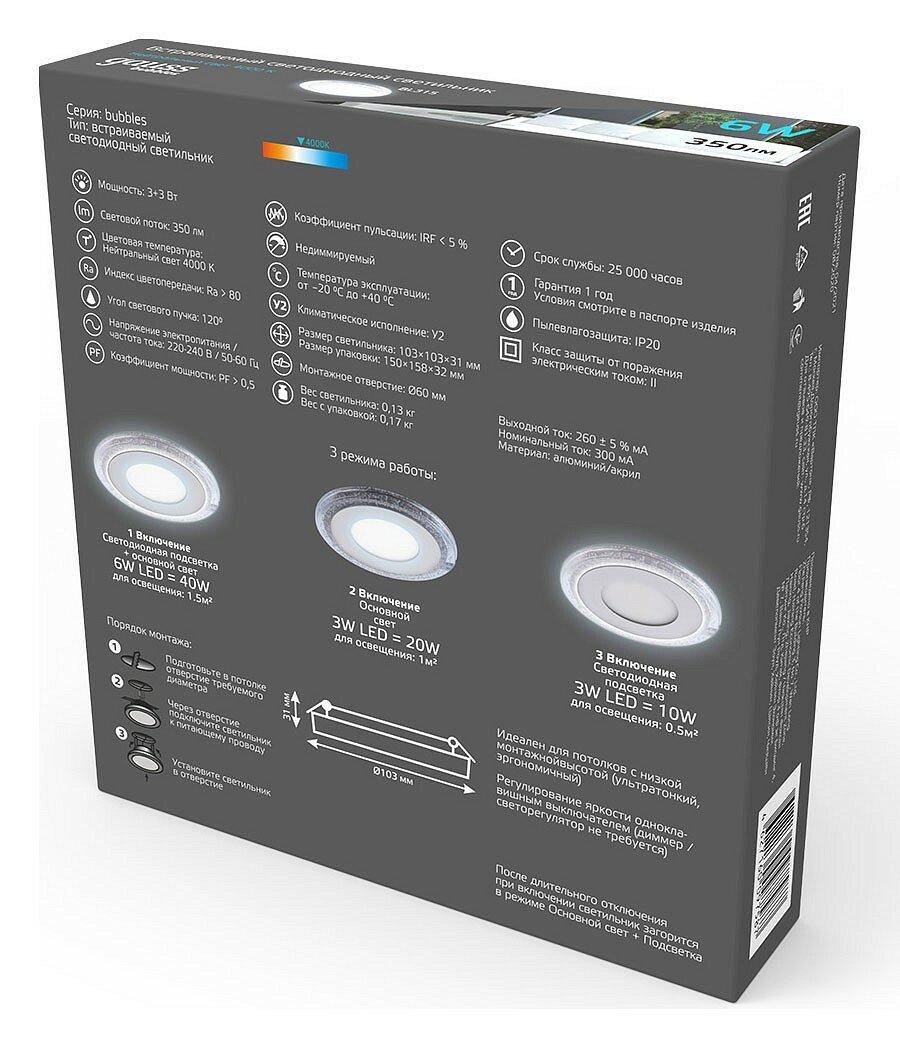 | Особенности | 3 режима свечения: основной свет + контурная подсветка, только основной свет, только контурная подсветка. |