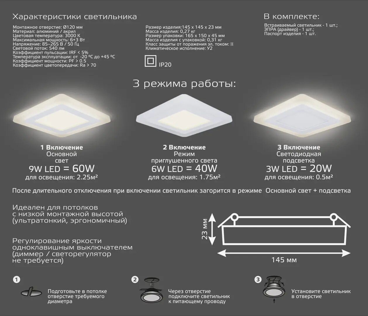 Устройство представлено в двух форм-факторах - квадрат и круг, что расширяет область применения. Не стоит беспокоиться и о цветовой температуре, так как светильники имеют два варианта - 4000К/3000К. Ваше пространство может преобразиться как теплым оттенком, так и приятным холодным светом.