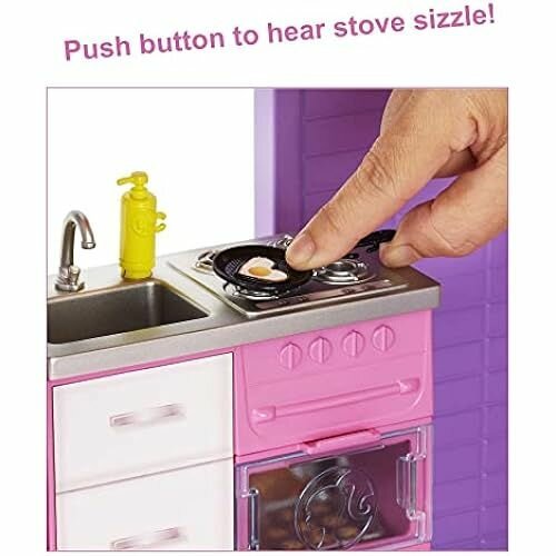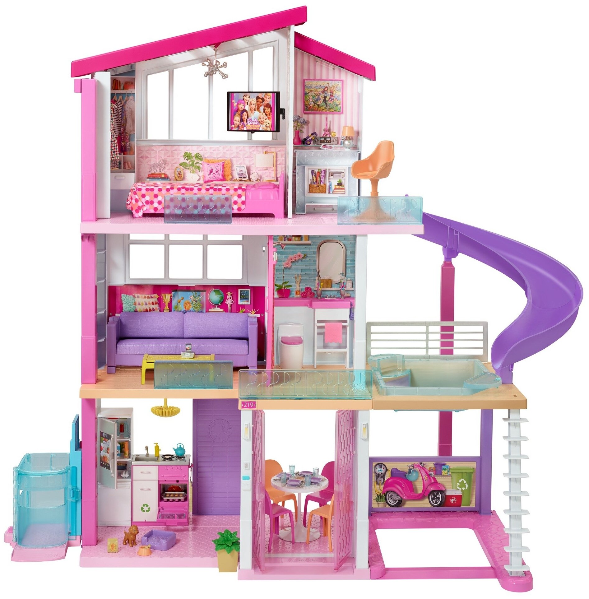 - Дом мечты Барби высотой более 90 см и шириной более 120 см включает в себя 3 этажа, 8 комнат, лифт и бассейн с горкой.