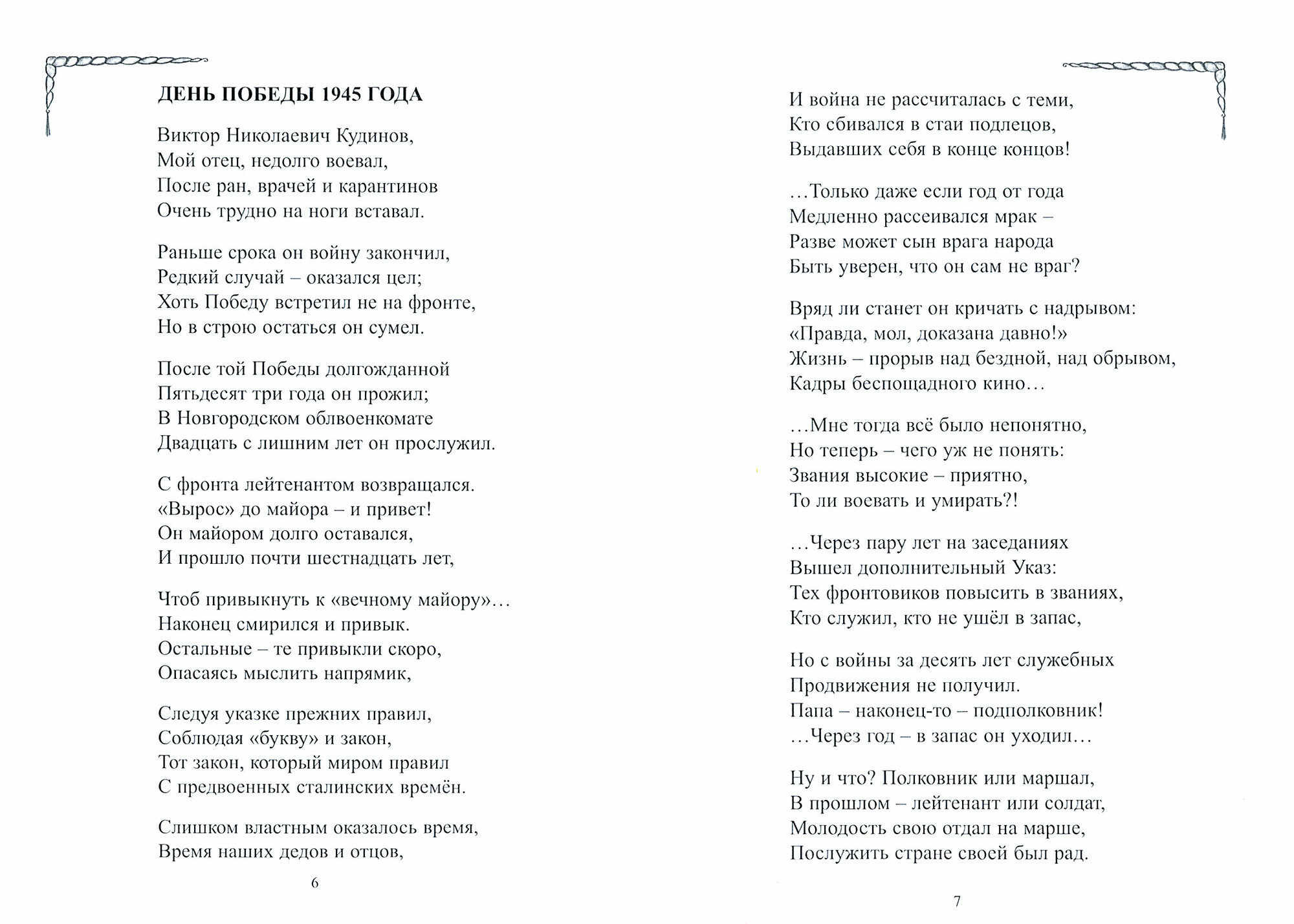The poem "Victory Day 1945" was written based on archival materials from the front-line soldier Viktor Nikolayevich Kudinov (October 1, 1922 - March 24, 1998), who fought on the Leningrad Front during the Great Patriotic War. The author does not separate the life story of a dear person from the life story of his people, his country. The Victory Day of 1945 is a day of victory over darkness, injustice, tyranny, a breakthrough to the creation of the present and future, a call to preserve and increase human values, without which our common House on a common Earth cannot exist.
