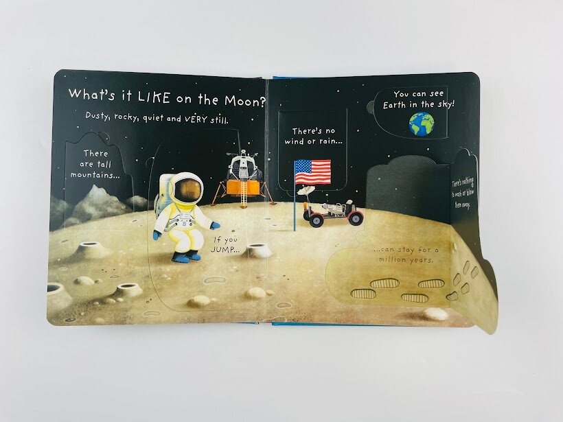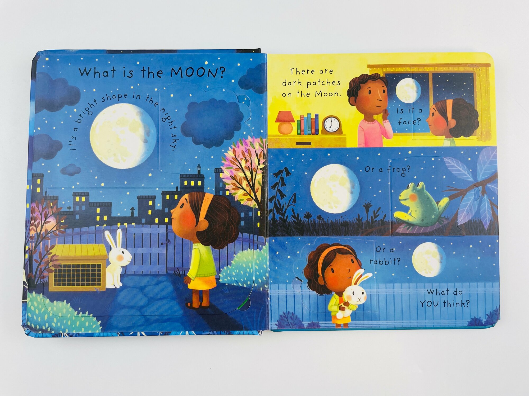 Замечательная книга от известного издательства Usborne. Книга не маленькая, из плотного картона с большими флэпами. Данная книга про луну и все, что с ней связано. Книга подойдёт для детей от 3-х лет. Много интересной информации, симпатичные иллюстрации, это все привлечёт вашего ребёнка и превратит занятия в удовольствие. Рекомендую!