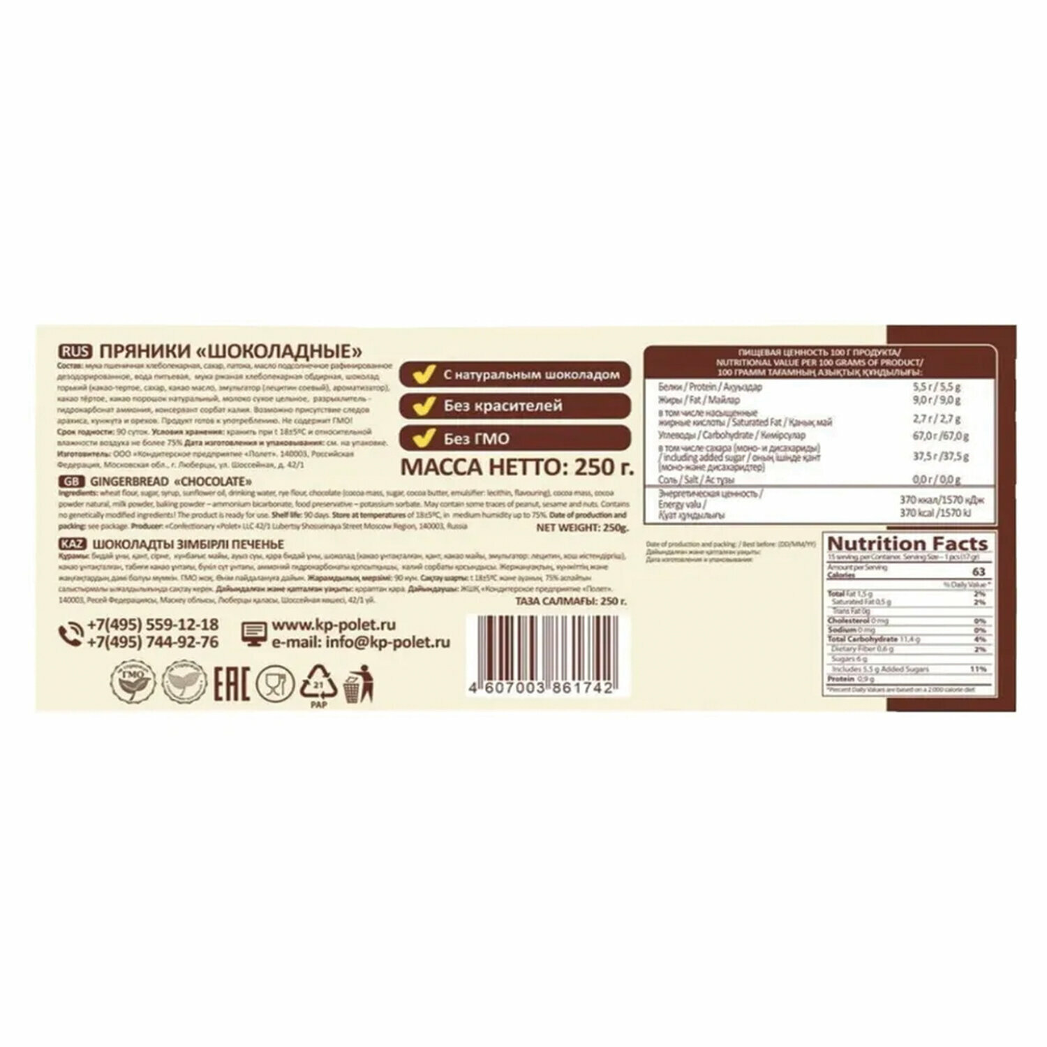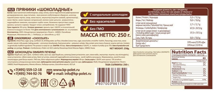 | Состав | Мука пшеничная хлебопекарная, сахар, патока, масло подсолнечное рафинированное дезодорированное, вода питьевая, мука ржаная хлебопекарная обдирная, шоколад горький (какао-тертое, сахар, какао масло, эмульгатор (лецитин соевый), ароматизатор), какао тёртое, какао порошок натуральный, молоко сухое цельное, разрыхлитель - гидрокарбонат аммония, консервант сорбат калия. |