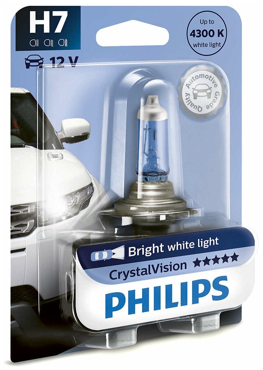 Галогенные лампы головного освещения Philips CrystalVision излучают яркий белый свет 4300 К и станут стильным решением для автомобильного освещения. Благодаря голубому покрытию и серебристому колпачку лампа станет стильным элементом в дизайне автомобиля.