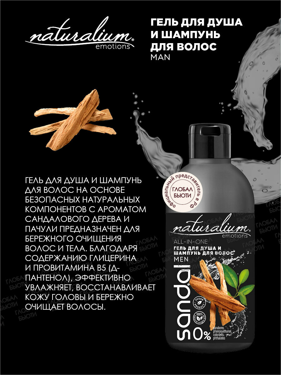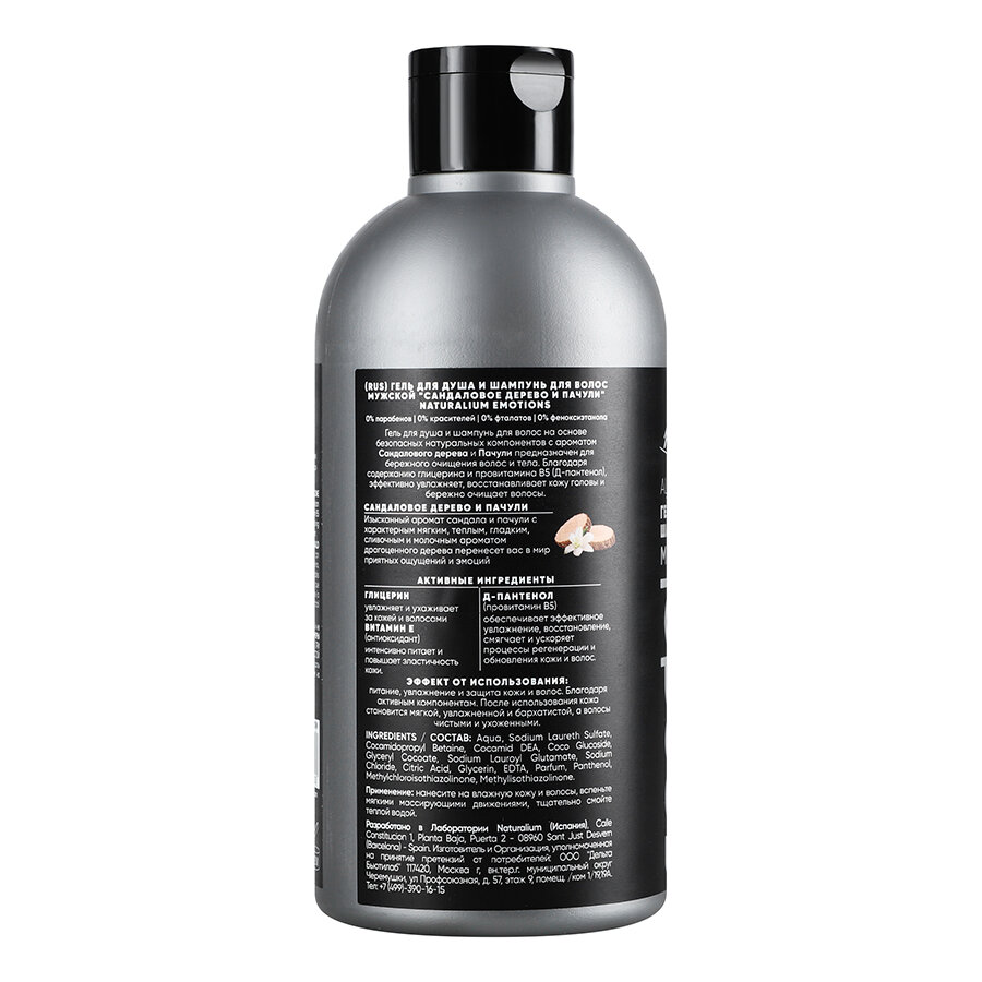 Гель для душа и шампунь для волос на основе безопасных натуральных компонентов с ароматом Сандалового дерева и Пачули предназначен для бережного очищения волос и тела. Благодаря содержанию глицерина и провитамина В5 (Д- пантенол), эффективно увлажняет, восстанавливает кожу головы и бережно очищает волосы.