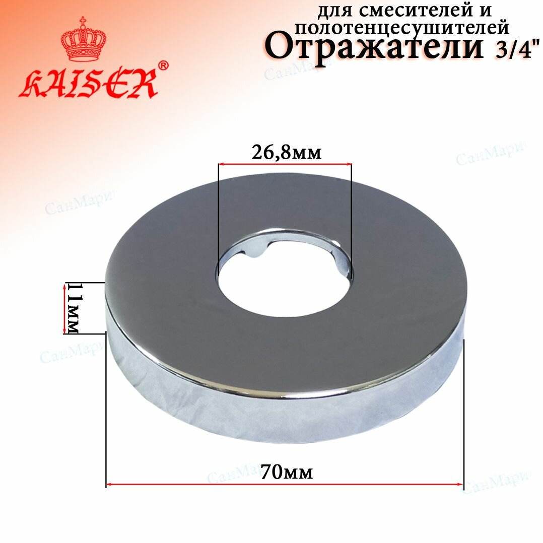 Отражатель 3/4" KAISER 0333 хром (глубокий) представляет собой хромированный элемент, который герметично закрывает пространство между стеной и выходом трубы для подачи воды, а также скрывает эксцентрики, которые используются для подключения смесителя к системе водоснабжения. Основным назначением отражателей является декоративная функция, которая позволяет придать интерьеру завершенный эстетичный вид. Преимуществами продукции являются прочность, надежность, простота установки. Меньший диаметр- 25 мм, больший- 60 мм, глубина 20 мм.