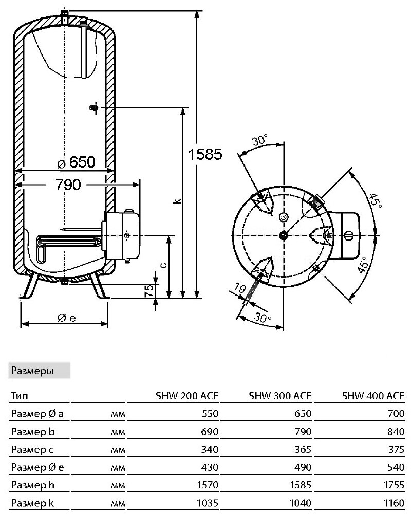 Водонагреватель накопительный SHW 300 ACE 2/3/4кВт (ВШГ)1585?650?790