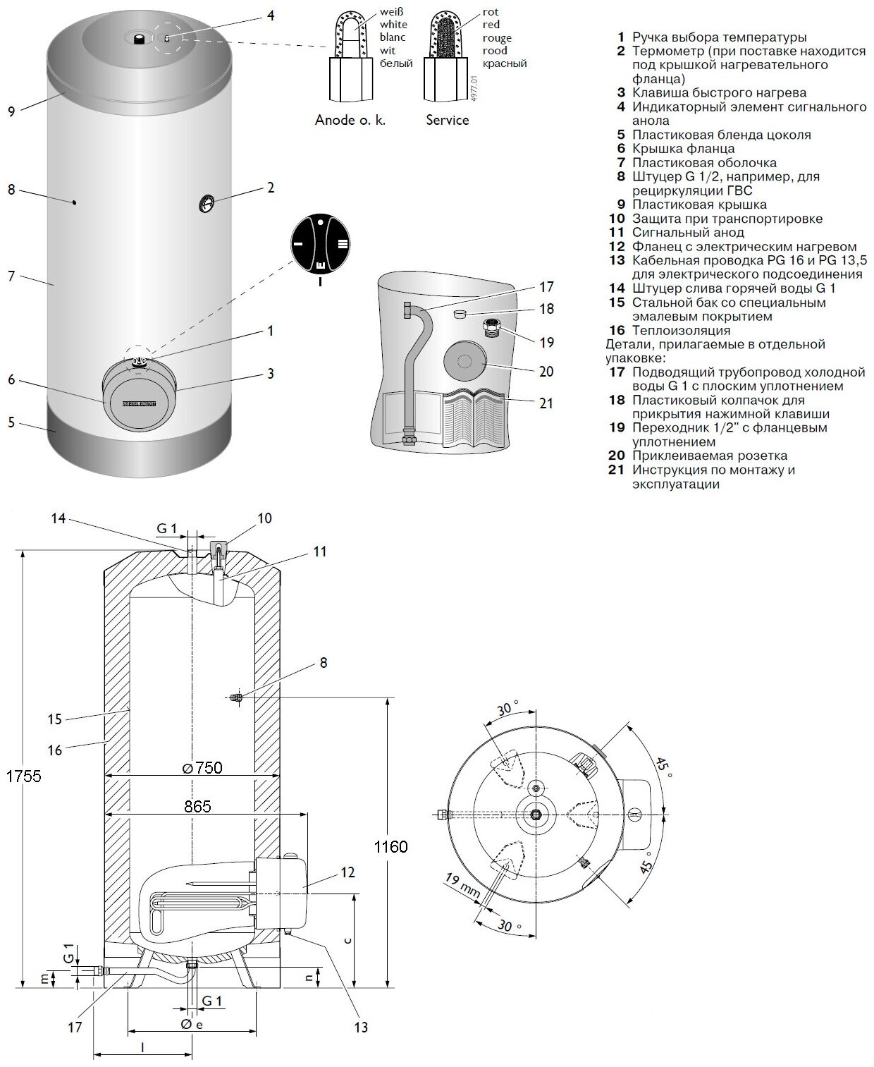 | Оснащение | световой индикатор, индикатор нагрева, антикоррозийный анод, термометр |