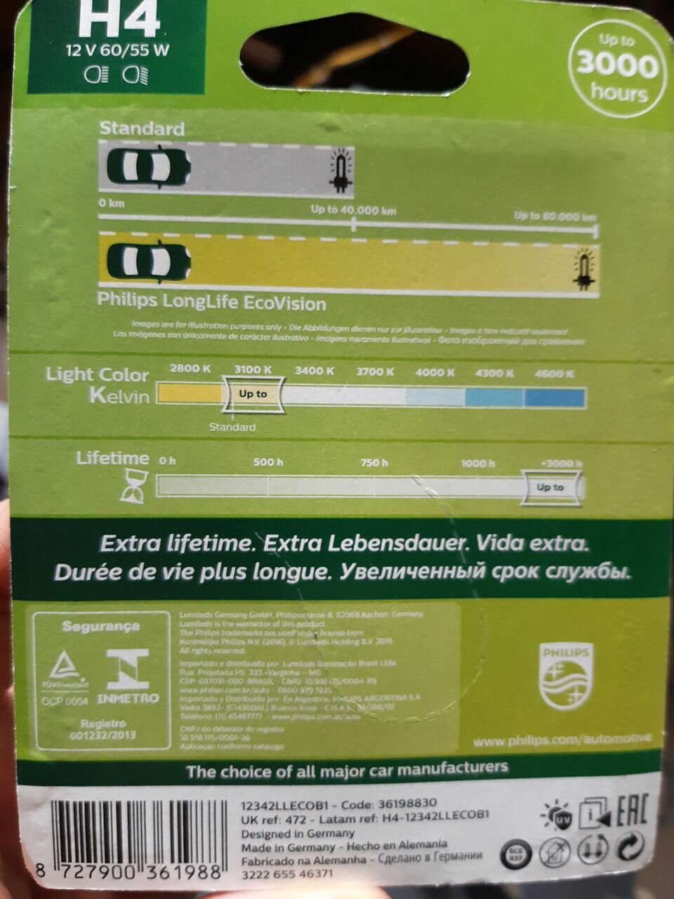 Автомобильная галогенная лампа из серии LongerLife Ecovision от компании Philips применяется для фар головной оптики, а именно ближнего и дальнего света. Они отличаются своим сроком эксплуатации, за счет высококачественной нити накаливания, который увеличен по сравнению со стандартными галогенными лампами, служат до четырех раз дольше, что эквивалентно 100 000 км пробега. Это лучшее решение для тех водителей, кто часто находится за рулем и пользуется дневными ходовыми огнями в светлое время суток.
