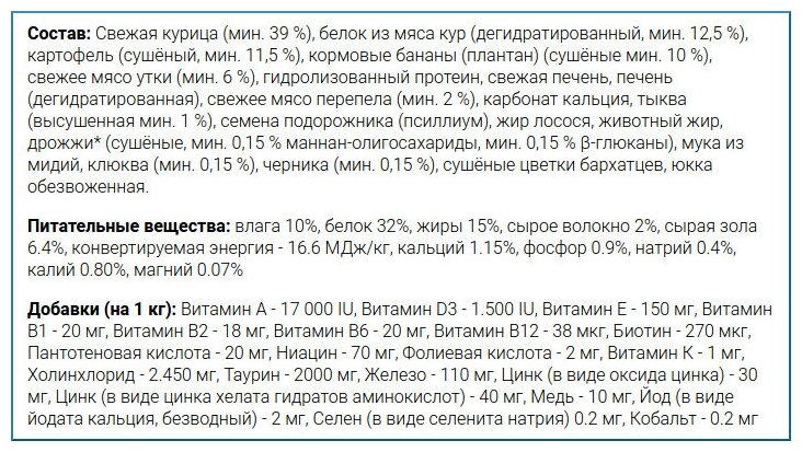 | Состав | Ингредиенты: Свежая курица (мин. 39 %), белок из мяса кур (дегидратированный, мин. 12,5 %), картофель (сушёный, мин. 11,5 %), кормовые бананы (плантан) (сушёные мин. 10 %), свежее мясо утки (мин. 6 %), гидролизованный протеин, свежая печень, печень (дегидратированная), свежее мясо перепела (мин. 2 %), карбонат кальция, тыква (высушенная мин. 1 %), семена подорожника (псиллиум), жир лосося, животный жир, дрожжи* (сушёные, мин. 0,15 % маннан-олигосахариды, мин. 0,15 % beta-глюканы), мука из мидий, клюква (мин. 0,15 %), черника (мин. 0,15 %), сушёные цветки бархатцев, юкка обезвоженная. |
