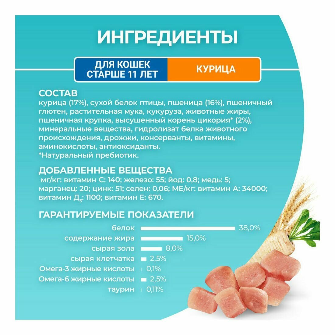 | Состав | Состав товара: курица (17%), сухой белок птицы, цельная пшеница (15%), кукуруза, кукурузный глютен, пшеничный глютен, соевая мука, животный жир, клетчатка, высушенный корень цикория, консерванты, минеральные вещества, вкусоароматическая кормовая добавка (c добавлением 0,025% высушенной инактивированной нагреванием смеси культур Lactobacillus fermentum и Lactobacillus delbrueckii), дрожжи, витамины, антиоксиданты. |