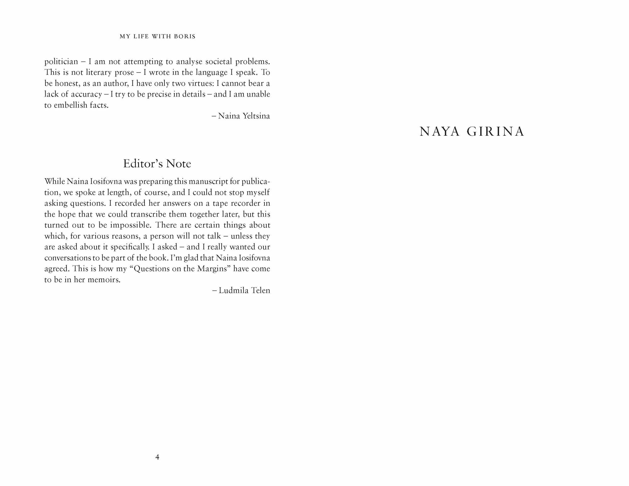In this poignant memoir, Naina Yeltsina, the wife of the first president of Russia, recounts the compelling story of her life, from her earliest childhood memories and the time when she met and became engaged to Boris Yeltsin, her companion of over fifty years, to the birth of her daughters and her experiences as First Lady of Russia.