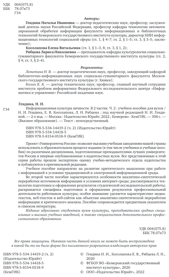Информационная культура личности в 2 ч. Часть 2 2-е изд. Учебное пособие для вузов (Гендина Наталья Ивановна; Косолапова Елена Витальевна; Рябцева Лариса Николаевна); ЮРАЙТ, 2022