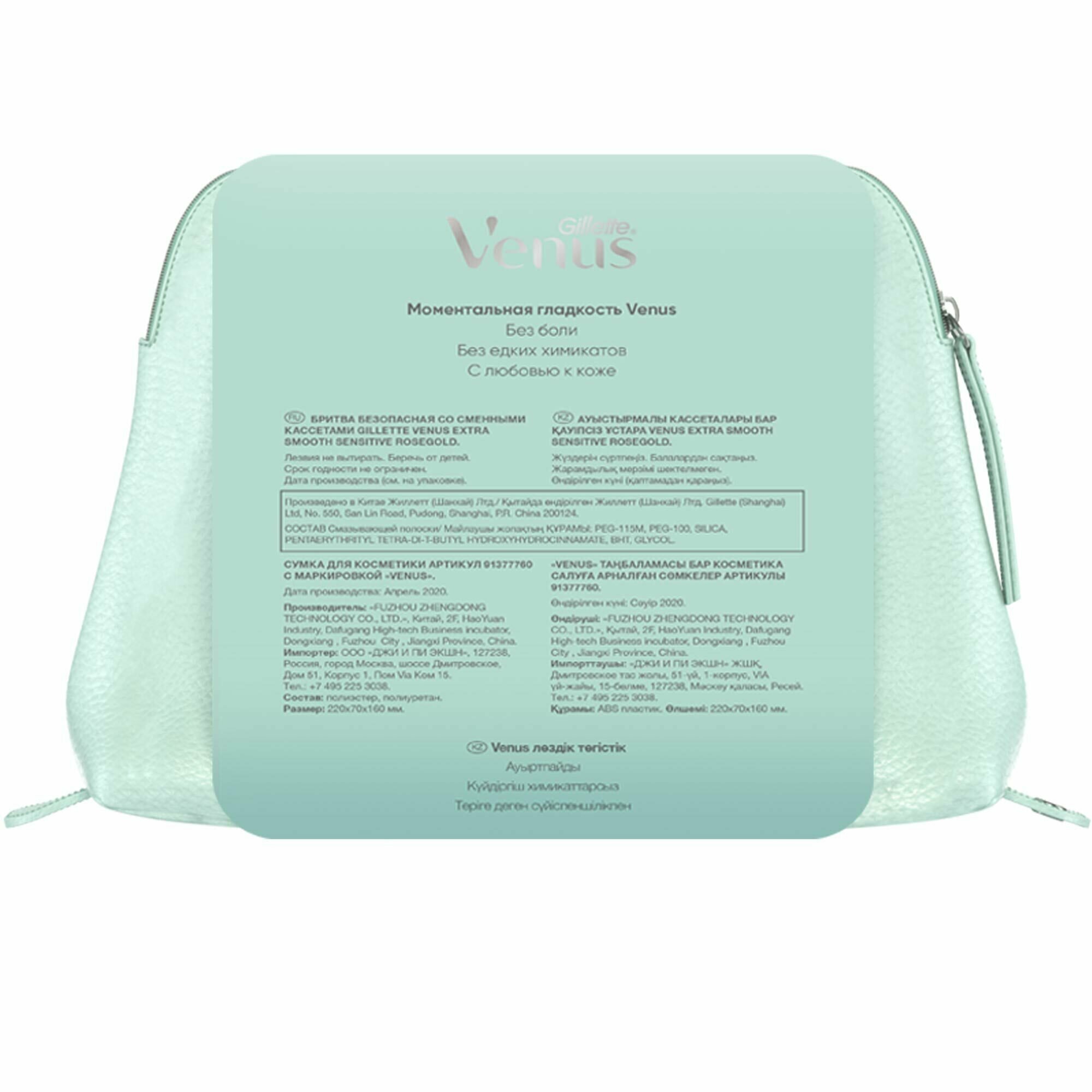 Gillette Venus (Жиллетт) Подарочный набор бритва Extra Smooth Sensitive Rosegold с 2 сменными кассетами + сумка для косметики Gillette (Shanghai) Ltd CN (1302630)