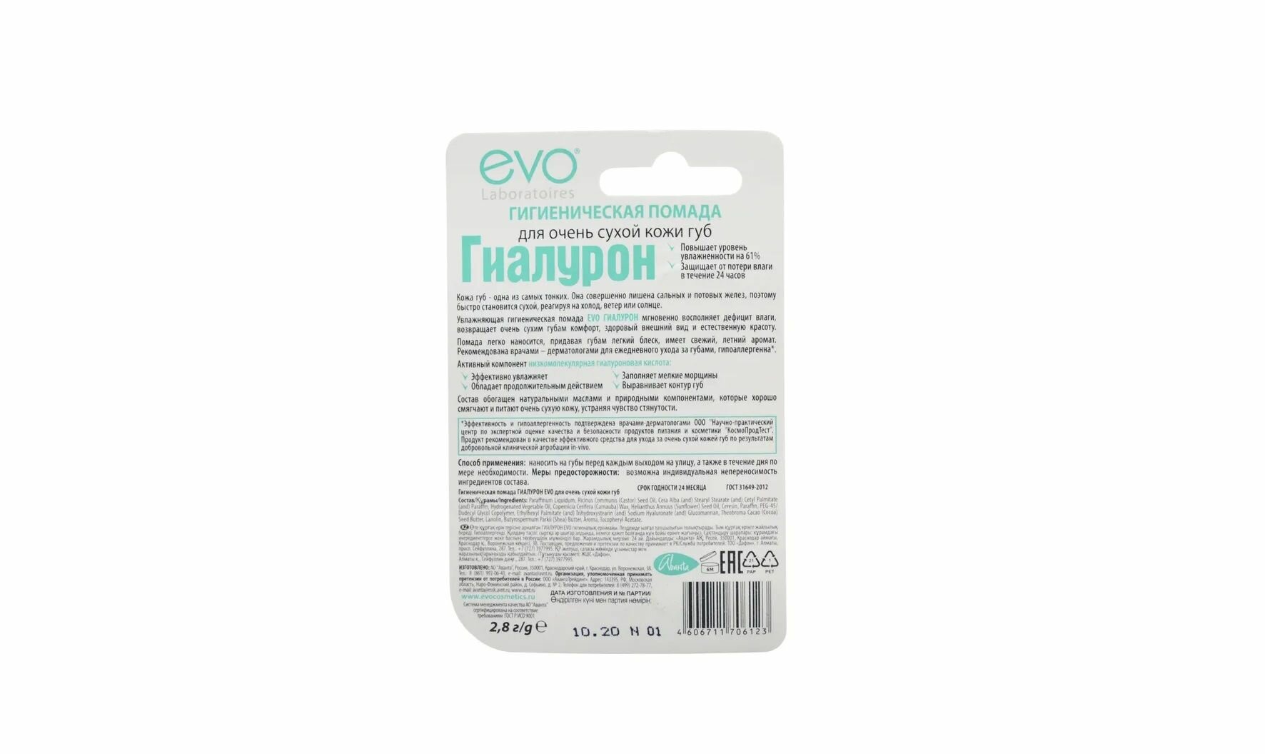 | Полное наименование | Помада гигиеническая Evo Гиалурон 2,8 г |