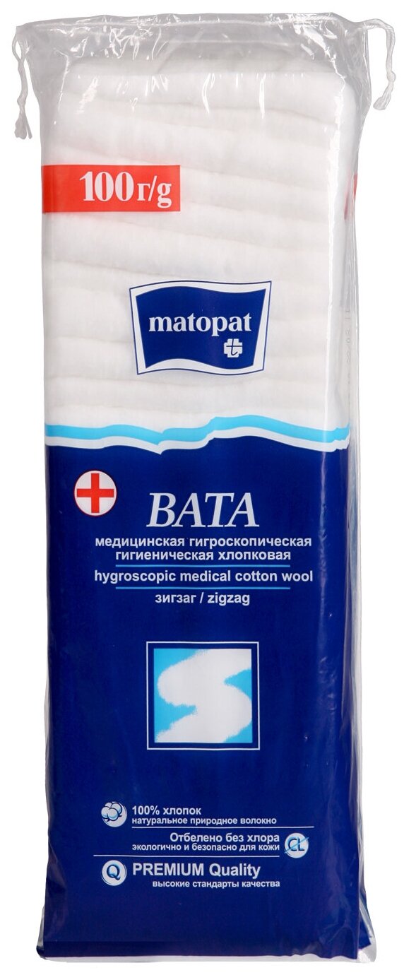 Вата медицинская гигроскопическая гигиеническая нестерильная "matopat" 100 грамм по гост 5556-81 хлопковая (упаковка зиг-заг). ООО Белла (573307)