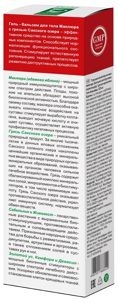 Эффективное натуральное средство для тела в области суставов на основе уникального природного компонента маклюры. Способствует улучшению функционального состояния, тормозит деструктивные процессы и активизирует регенерацию. Биологический состав крымской маклюры делает его уникальным природным иммуномодулятором с широким спектром действия. Маклюра способна оказывать лечебное воздействие на целый ряд суставных заболеваний, таких как: артрит, артроз, бурсит, подагра, остеохондроз, радикулит, ревматизм.Грязи Сакского озера оказывает противовоспалительное и антисептическое действие, укрепляет защитные функции организма и иммунную систему, нормализует обмен веществ. Грязевыми аппликациями излечивают широкий спектр болезней, в том числе: заболевания опорно-двигательного аппарата, центральной нервной системы и кожные болезни.