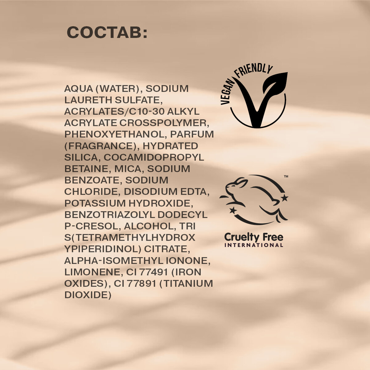 | Состав | Water (Aqua), Sodium Laureth Sulfate, Hydrated Silica, Acrylates/C10-30 Alkyl Acrylate Crosspolymer, Cocamidopropyl Betaine, Disodium EDTA, Glycerin, Mica, Benzotriazolyl Dodecyl P-cresol, Sodium Carbonate, Alcohol, Tris (Tetramethylhydroxypipendinol) Citrate, Phenoxyethanol, Sodium Benzoate, Potassium Hydroxide, Sodium Chloride, Sodium Hydroxide, Alpha-isomethyl Ionone, Limonene, Alcohol, Titanium Dioxide (CI 77891), Iron Oxides (CI 77491). Parfum (Fragrance) |