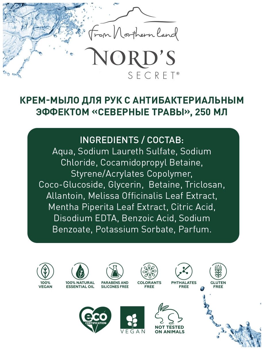 Сервис сравнения цен СкидкаГИД предлагает сравнить цены на товар «Крем-мыло Nord s Secret С антибактериальным эффектом северные травы 250мл»