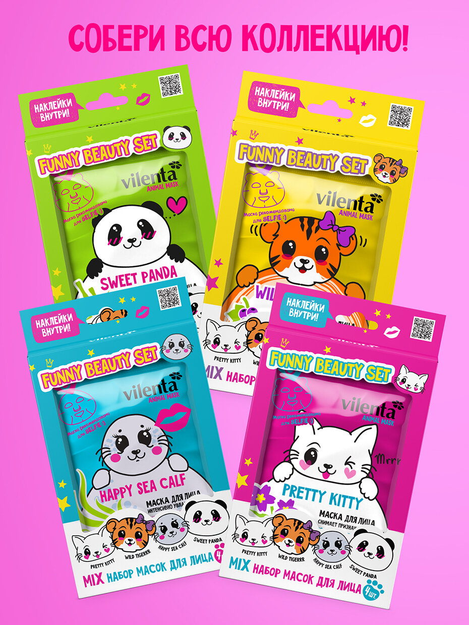 Маска для лица тканевая 7DAYS. Набор из 4х масок отличный подарок и просто приятный сюрприз вне зависимости от повода! Увлажняющие тканевые маски для лица с лекалом в виде животных не только обеспечат высококачественный уход за лицом, но и превратят ритуал красоты в настоящее beauty-шоу! Маски для лица тканевые с изображением котика, панды, тигра и морского льва. Подарочный набор состоит из четырех разных масок коллекции Animal, отличается лишь изображение на упаковке: Маска для лица с Малиновым соком и Лавандой PRETTY KITTY придает коже мягкость и гладкость, делает ее бархатистой на ощупь, успокаивает и снижает чувствительность. Придает вашей коже мягкость и гладкость, делает ее бархатистой и приятной на ощупь. Витаминный коктейль оказывает глубокое регенерирующее действие, помогая коже выглядеть здоровой.Маска с экстрактом Водорослей и Белый мхом HAPPY SEA CALF питанет, повышает эластичность и тонус кожи. Экстракты водорослей дарят вашей коже чувство свежести, повышают тонус и эластичность. Маска очищающая с экстрактом Бамбука и Соевым маслом SWEET PANDA стимулирует процессы очищения и детоксикации, способствует +избавлению от черных точек и следов акне, оказывает глубокое восстанавливающее действие. Маска для лица тонизирующая с Таежными ягодами и Вербеной WILD TIGER интенсивно заряжает кожу энергией, тонизирует и стимулирует регенерацию клеток, всего за 20 минут стирая следы усталости. Интенсивно действует на кожу, тонизируя и придавая ей энергию.Уходовая косметика 7DAYS подарки для женщин. 7DAYS подарки, подарок для жены, подарок для мамы, подарки на день рождения, подарок на 8 марта, подарок 8 марта, подарок на новый год, подарок на новый год женщине, подарок на нг, подарок на др, подарок любимой девушке, подарок для подруги, подарок маме на день рождения.Косметика для тела 7days подарки на 8 марта! Март - Дари красиво вместе с 7DAYS!