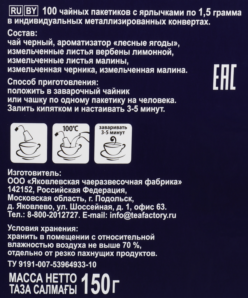 | Состав | Чай чёрный, ароматизатор "лесные ягоды", измельченные листья вербены лимонной, измельченные листья малины, измельченная черника, измельченная малина. |