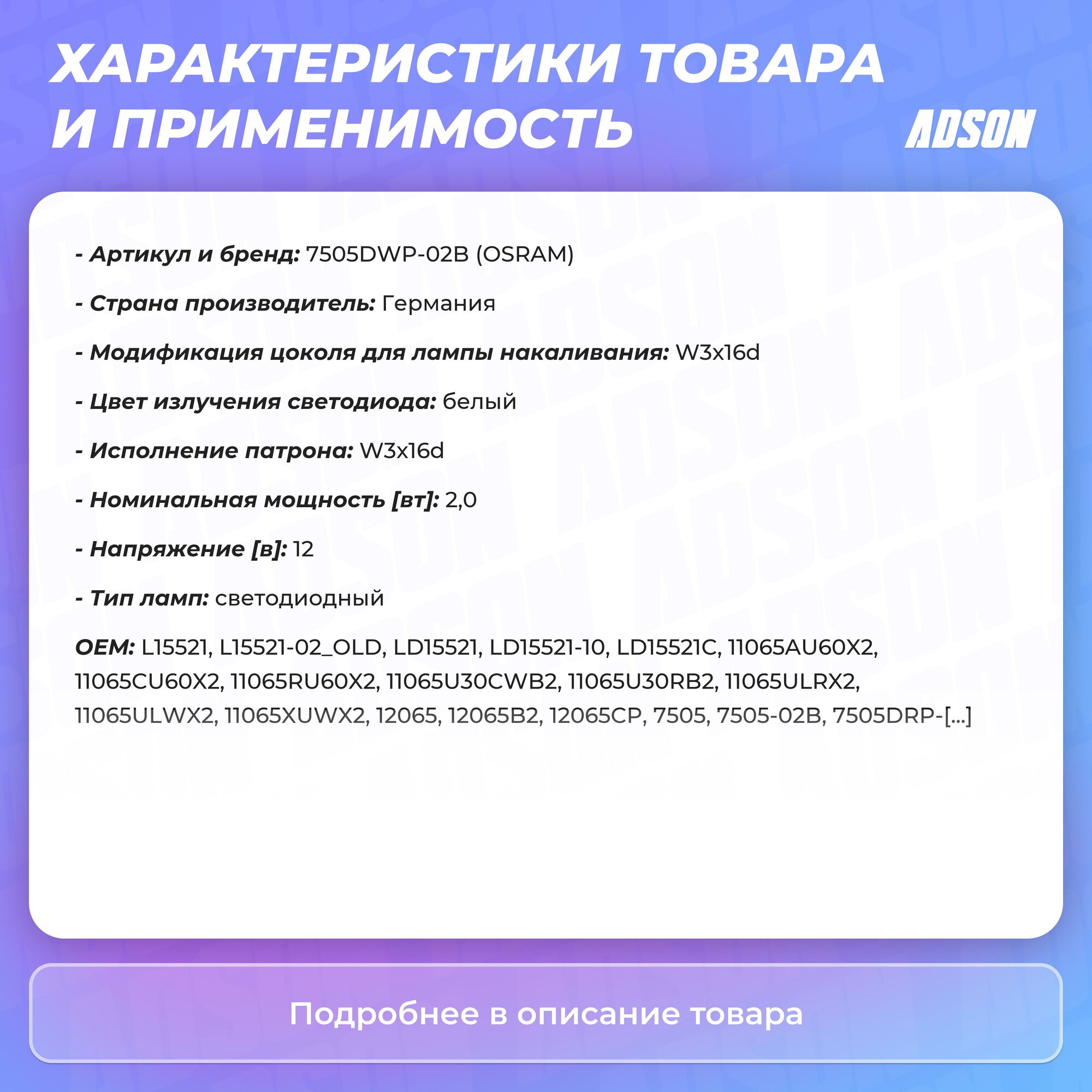 Светодиодные лампы OSRAM ≠ W21W LEDRIVING SL 7505DRP-02B характеризуются равномерным распределением света по всем направлениям, увеличенным сроком службы, низким энергопотреблением и элегантным исполнением.