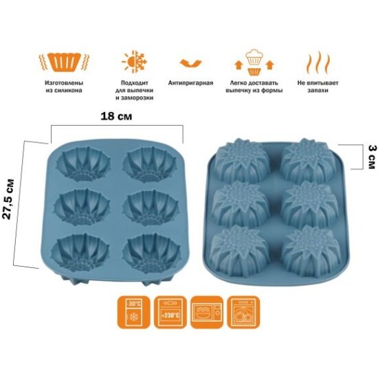 Форма для выпечки силиконовая прямоугольная на 6 кексов 27,5х18х3 см PERFECTO LINEA серо-голубой () подхотит не только для выпечки, но и для заморозки. Используется во всех типах печей, кроме печей с открытым огнем и использованием функции "гриль". Обладает противоприлипающим и антипригарным свойствами, поэтому не требуется использовать масло. Не привередлива к перепадам температуры, выдерживает от -40 °С до +230 °С. Легко моется, эластична, не горит, не тлеет, не впитывает запахи, не оставляет пятен. Абсолютно безвредена для здоровья.
