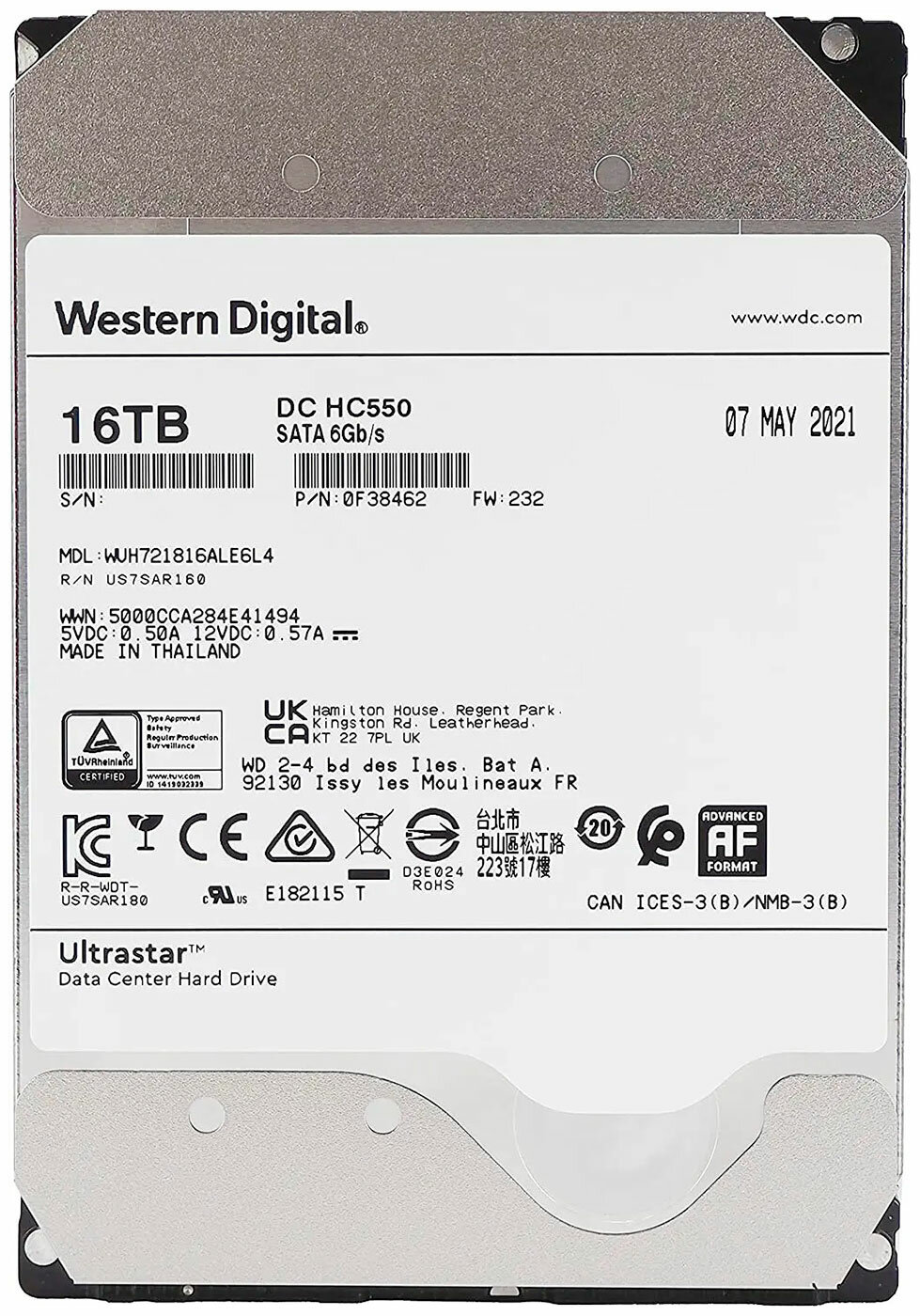 Жесткий диск 16TB SATA 6Gb/s Western Digital Ultrastar DC HC550 3.5’’ 7200rpm 512MB (0F38462) WUH721816ALE6L4