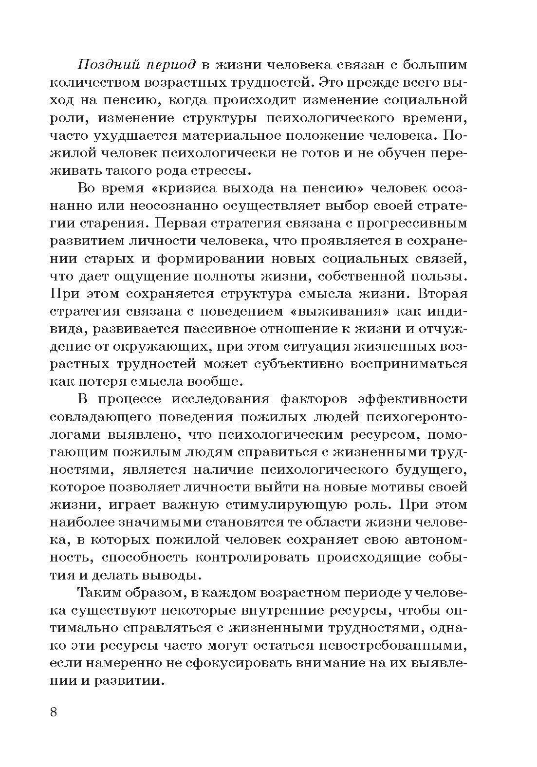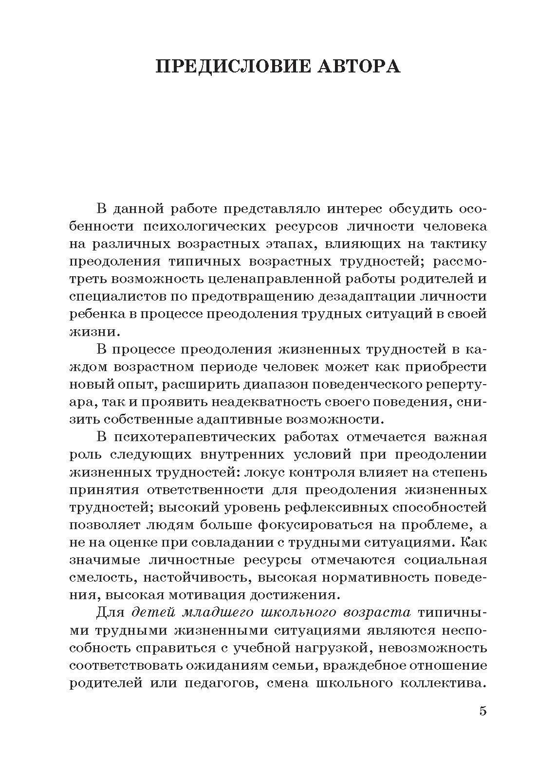 Книга посвящена вопросам активизации психологических ресурсов личности человека на различных возрастных этапах его жизни. В нестандартных или трудных ситуациях появляется возможность активизировать наши потенциальные способности, которые влияют на тактику преодоления не только стрессовых ситуаций, но типичных возрастных трудностей. Вот только возникает вопрос: пользуемся ли мы возможностью актуализировать свои психологические ресурсы – личностные отношения, интеллектуальные способности, систему психологической саморегуляции, практические и социальные навыки? В книге представлены статьи по вопросам развития личностных и социальных ресурсов человека в различные возрастные периоды – в детстве, подростковом возрасте, юности и зрелости. Данная монография предоставляет интересную психологическую информацию как для специалистов – психологов, педагогов, так и для широкого круга читателей. Специалисты найдут в этой книге данные исследований автора, обсуждаемые с точки зрения личностных возможностей человека, а также практические рекомендации по психологической поддержке людей разного возраста в трудных жизненных ситуациях. Родители обратят внимание на то, каким образом они могут помочь своему ребенку выработать в процессе взросления жизнестойкость, развивая свои личностные качества, а также практические и социальные навыки.