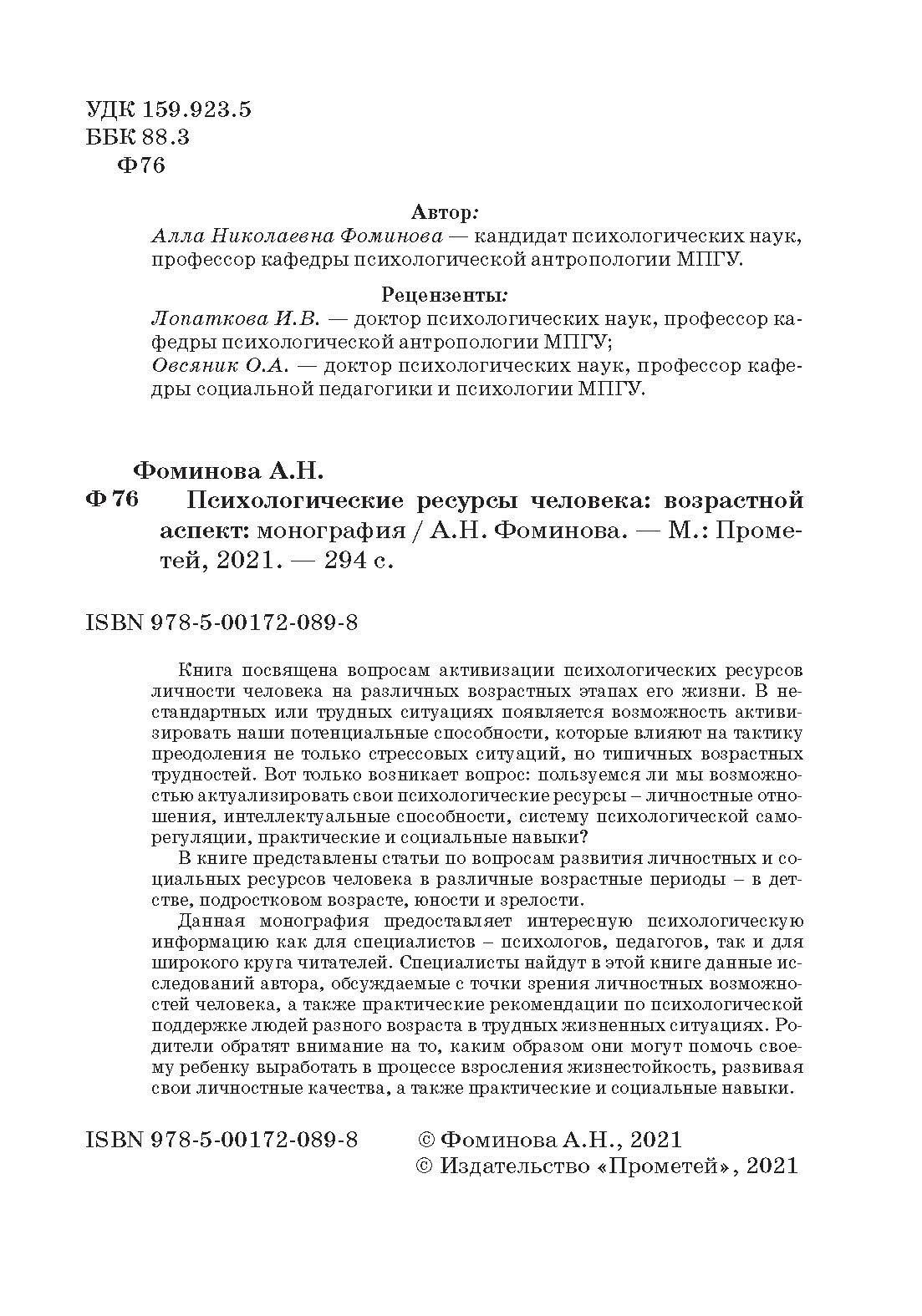 Психологические ресурсы человека возрастной аспект (А. Н. Фоминова); Прометей, 2021