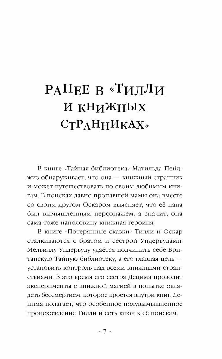 Тилли больше не может этого терпеть! Злодеи Ундервуды запретили книжные странствия и всё ближе подбираются к ней, но, хотя у Тилли есть план найти таинственных Архивариусов и остановить негодяев, никто ей не верит и не хочет помогать. Конечно, её лучший друг Оскар всегда на её стороне, однако, к счастью, находится кое-кто ещё, кто готов рискнуть, чтобы спасти книжные странствия! И теперь Тилли и Оскара ждёт путешествие в США, а затем - самое невероятное книжное странствие в их жизни и встреча с самим Уильямом Шекспиром! И всё ради того, чтобы найти Архивариусов. Вот только что будет, если Архивариусы не смогут им помочь?