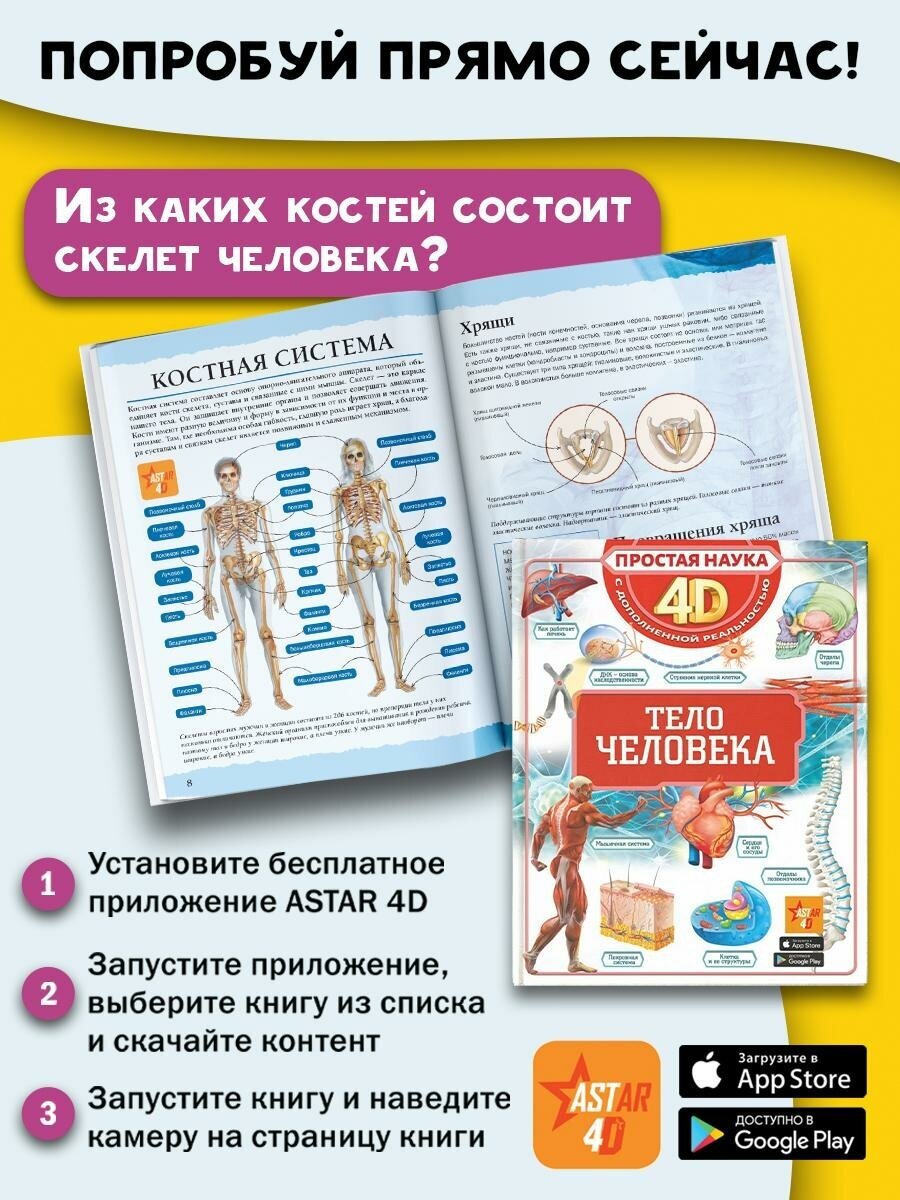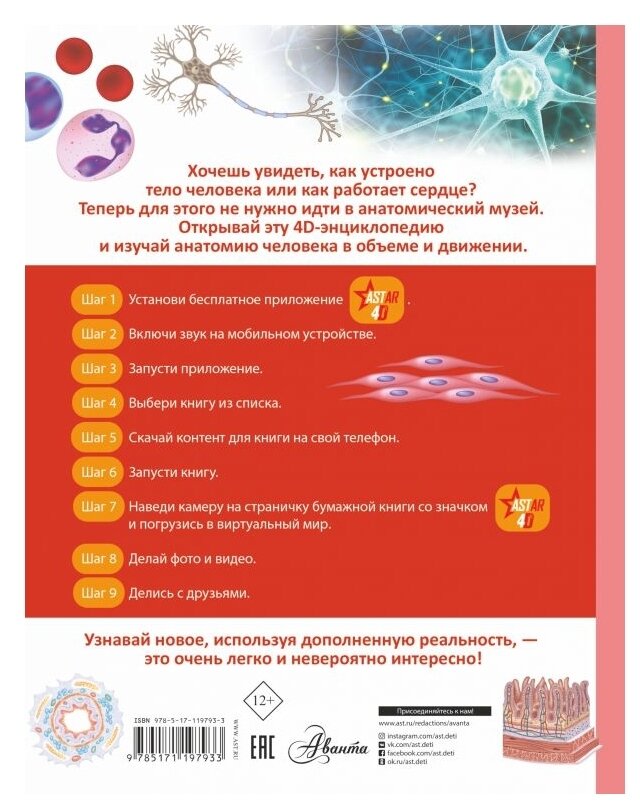 Эта книга рассказывает об анатомии и физиологии человека. Познакомиться со строением человеческого тела и понаблюдать за работой внутренних органов теперь можно прямо на этих страницах, ведь это не обычная книга, а 4D-издание! Читай, изучай иллюстрации, рассматривай объемные движущиеся модели, слушай познавательные аудиозаписи. Элементы дополненной реальности обязательно помогут новым знаниям запомниться надолго.