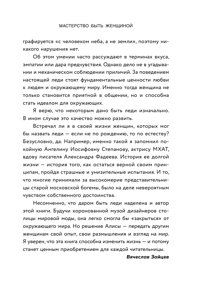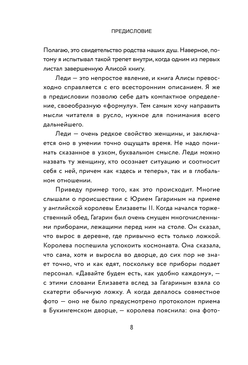 Быть настоящей леди - это не про английские салоны девятнадцатого века. Это про сегодняшний день. Про умение вписаться в любую компанию. Про умение привлекать и очаровывать. Про сохранение чувства собственного достоинства даже в самой сложной ситуации. Алиса Крылова, победительница Миссис Россия 2010 и мирового конкурса красоты Mrs Globe 2011, главный редактор журнала L'officiel Kids и посол Всемирного Благотворительного фонда W.I.N. Foundation, объясняет, как быть леди нового времени. В своей книге она выделяет семь областей, в которых нужно достичь совершенства, и дает простые рекомендации, чтобы:
