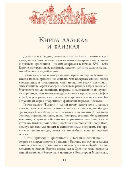 Истории, входящие в иллюстрированное издание "Арабских сказок", весьма разнородные по стилю и содержанию, восходят к арабскому, иранскому и индийскому фольклору. Это калейдоскоп событий и образов давно минувшей эпохи с пестрым колоритом нравов и быта различных слоев населения во времена правления багдадского халифа Харун ар-Рашида. Связующим звеном всех сказок является мудрая и начитанная дочь визиря Шехерезада. Спасаясь от расправы Шахрияра, после измены ополчившегося на всех женщин, Шехерезада своими историями отвлекает тирана от мрачных мыслей и разжигает его любопытство, прерывая свой рассказ на самом интересном месте!