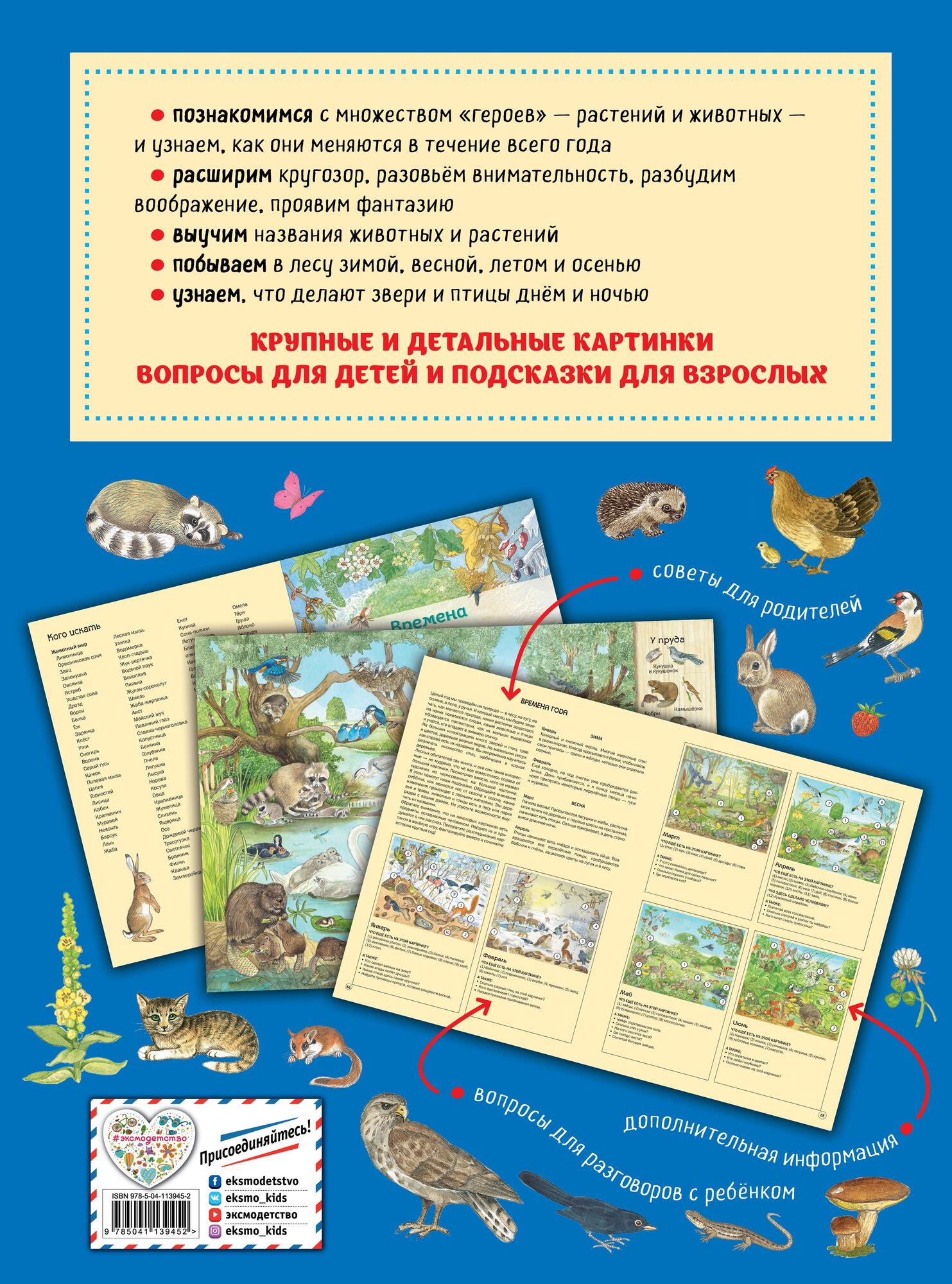 Тематические главы расскажут, как происходит смена времен года, какие растения и животные живут в лесу, кого из них можно увидеть ночью, а кого днем. Весной и летом рождаются малыши, и мы проследим, как они растут, учатся, меняются. В конце книги есть страницы с подсказками для родителей, как более интересно и результативно заниматься с ребенком.