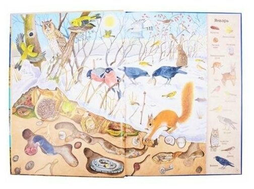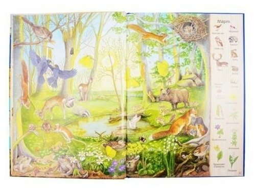 В этой книге исключительные иллюстрации, они интересны и взрослым и детям. Формат подачи информации очень эффективный для запоминания, много картинок и немного пояснений. В конце книги отличный словарь. Книгу можно рассматривать часами и параллельно рассказывать ребёнку о временах года, месяцах, о животных и растениях, об изменениях в природе. Очень полезная и познавательная литература.